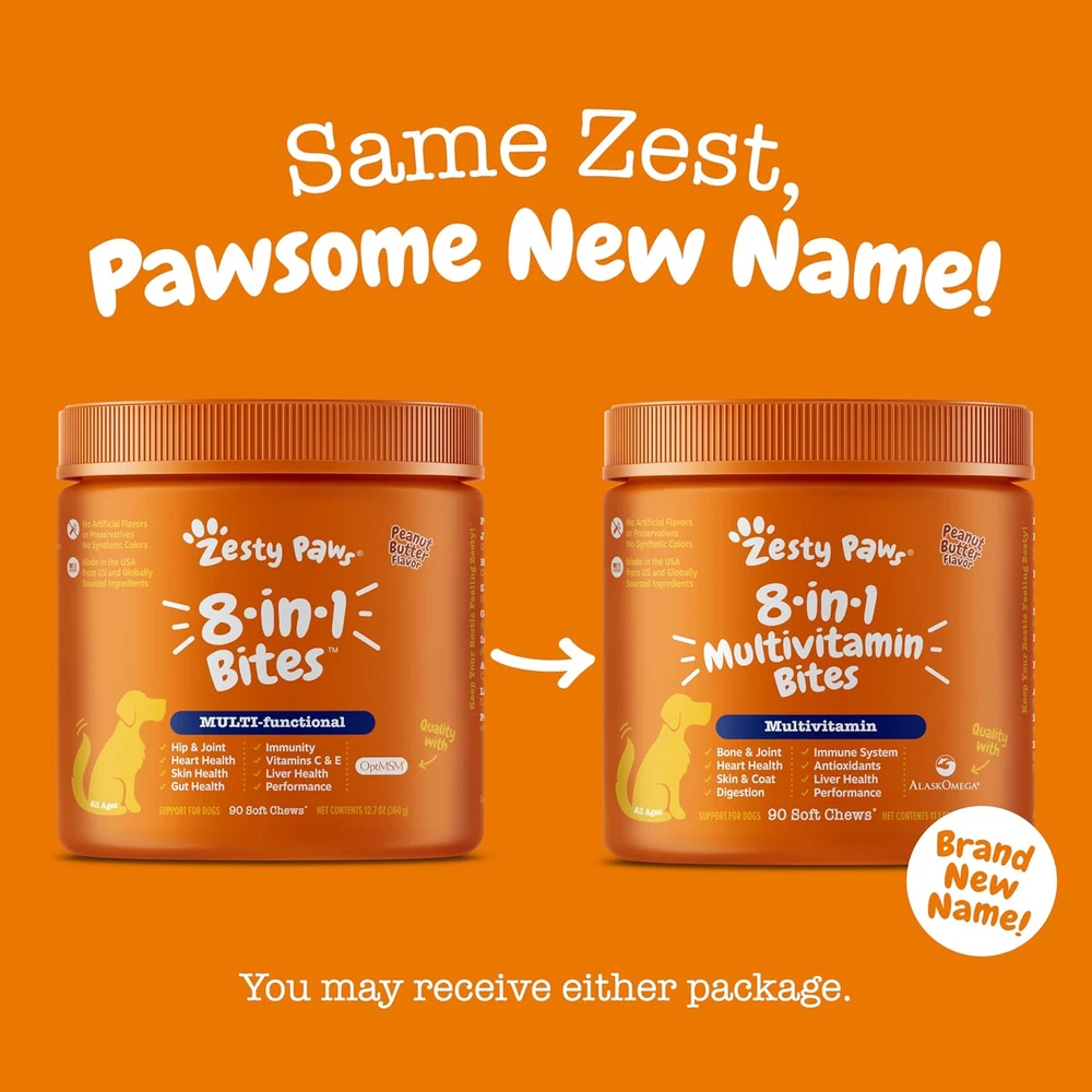 Store New Arrivals Add to Favorite View Feedback Contact Zesty Paws Dog Multivitamin, Chewable Dog Vitamins and Supplements for Hip & Joints, Skin & Coat, Omega 3 Fish Oil for Dogs- Senior & Puppy Multivitamin - Peanut Butter- 90Ct Description Item model number Z062P Manufacturer Zesty Paws Item Dimensions LxWxH 3.5 x 3.5 x 4 inches Brand Name Zesty Paws Active Ingredients soy,vitamin e Product Dimensions 3.5 x 3.5 x 4 inches; 11.2 ounces Country of Origin USA Specific Uses for Product Heart, Stomach, Joints Item Weight 11.2 ounces Is Discontinued By Manufacturer No Number of Items 1 Target Audience Keyword Dogs, dogs Flavor Name Peanut Butter Directions Begin with half the suggested amount, and gradually increase to the suggested daily amount. Amounts can be split between AM and PM. Up to 25lbs = 1 Chew, 26-75lbs = 2 Chews, Over 75lbs = 3 Chews. Size 90 Count (Pack of 1) Item Form Soft Chew Brand Zesty Paws Item Package Dimensions L x W x H 4.01 x 3.66 x 3.61 inches Breed Recommendation All Breeds HEART AND IMMUNE SUPPORT: These multifunctional dog supplements & vitamins feature CoQ10, Cod Liver Oil, and Vitamins A, C, and E to support cardiovascular and immune health for pets ADVANCED 8-IN-1 FORMULA: Zesty Paws 8 in 1 Multifunctional Bites include premium ingredients for physical performance, joint support, heart, immune, skin, liver, and gut health HEALTHY SKIN AND COAT: Specifically designed for dogs with sensitive skin, this dog skin and coat supplement includes Cod Liver Oil and Vitamin E to promote skin and coat health HIP AND JOINT SUPPORT: This dog joint supplement contains Glucosamine, delivering essential nutrients for hip and joint health, providing mobility and muscular support for senior dogs and puppies DIGESTIVE AND GUT HEALTH: Each dog vitamins multivitamin contains a six-strain blend for gut health for dogs and digestive health, encouraging healthy gut flora and bowel regularity in dogs Product Description Pawesome Pairings with 8-in-1 Multivitamin Bites Add to Cart Add to Cart Add to Cart Add to Cart Add to Cart Add to Cart Customer Reviews 4.5 out of 5 stars 42,255 4.6 out of 5 stars 11,834 4.5 out of 5 stars 42,255 4.5 out of 5 stars 42,255 4.5 out of 5 stars 42,255 4.5 out of 5 stars 42,255 Price $32.97 $ 32 . 97 $42.97 $ 42 . 97 $32.97 $ 32 . 97 $20.97 $ 20 . 97 $19.97 $ 19 . 97 $74.97 $ 74 . 97 Use Case All Ages 8 in 1 Multivitamin For Seniors - 11 in 1 Bites Made with an Ancient Base 8 weeks to 1 year old - Multi Mini Bites for Smaller Pups All Ages Multi 250 count Premium Active Ingredients OptiMSM, CoQ10, AlaskOmega OptiMSM, CoQ10, AlaskOmega OptiMSM, CoQ10 OptiMSM, CoQ10, AlaskOmega OptiMSM, CoQ10, AlaskOmega OptiMSM, CoQ10, AlaskOmega Yummy Flavors Chicken & Peanut Butter Chicken & Beef Bison Chicken Chicken Chicken Made in the USA ✔ ✔ ✔ ✔ ✔ ✔ No Artificial Flavors ✔ ✔ ✔ ✔ ✔ ✔ 3rd Party Tested ✔ ✔ ✔ ✔ ✔ ✔ ABOUT US We offer the best prices around on high quality products. Our E-store includes media such as books, movies, music and games while offering electronics, toys, sporting apparel, clothing, tools, general home, garden items and more. SHIPPING We are always working hard to ensure your package arrives as soon as possible. Please understand that some factors like weather, high postal traffic, and the performance of shipping companies are outside of our control. We offer free shipping to the lower 48 states and ship within 2 business days of payment, usually sooner. We do not accept P.O. Boxes. Please provide a physical address. RETURNS We offer a 30-Day Return Policy on items which you are not completely satisfied with. You have the option for a full-refund or an exchange of the item. No returns are available on items shipped outside of the USA. PAYMENT We accept PayPal. CONTACT US This page content is yet to come Please ad us to your favorite seller and visit again later Thank You CUSTOMER SATISFACTION We try our very best to make sure every customer is completely satisfied. If there's a problem, message us! We're happy to help.