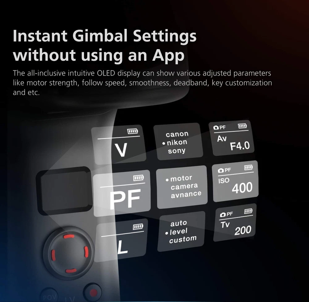 WEEBILL-S comatible with mainstream mirrorless and DSLR camera & lens combos. Like SONY a9/a9II/a7R4/a7R3/a7M3/a7S3/a7R2/a7M2/a7S2/a7C/a6600//a6500/a6400/a6300/a6100/a6000.Panasonic GH5/GH5S/S1/S5//S1H/DC-BGH1. Canon 5D3/5D4/5DS/5DS R/6D/6D2/80D/90D/M50/EOS R5,M6 Mark 2,R6,R,,RP Nikon D850/Z5/Z6/Z6 II/Z7/Z50. Fujifilm X-T3/X-T4/ X-T30.Olympus OM-D E-M1 Mark II,ZCAM E2,BMPCC 4K/6k 【Compact Size as A4 Paper】 Ergonomically designed Sling mode to save effort and provide comfortable underslung shooting experience 【8th Instune Algorithm】 provides high responsiveness and eliminates jittery in fast movement in any environment 【14 hours Battery Life】 Brand new TransMount Image Transmission Module (accessory) to offer 1080P 30fps highly synchronised transmission and up to 3 screen receivers 【Quick Release System】OLED display; Dual focus control system Inherited Ergonomic Design Compact as a piece of A4 paper. The ergonomic Sling design provides an effortless shooting experience as always. ViaTouch 2.0: Your Finger-Touch Vision World Using with TransMount Image Transmission Module(accessory), you can turn your phone screen into a professional monitor and multi-functional remote controller. Up to 3 Devices Sync Motion When mounted with the image transmission receiver and transmitter(accessory), up to 3 devices can be connected to your stabilizer, including smartphones, iPads, and