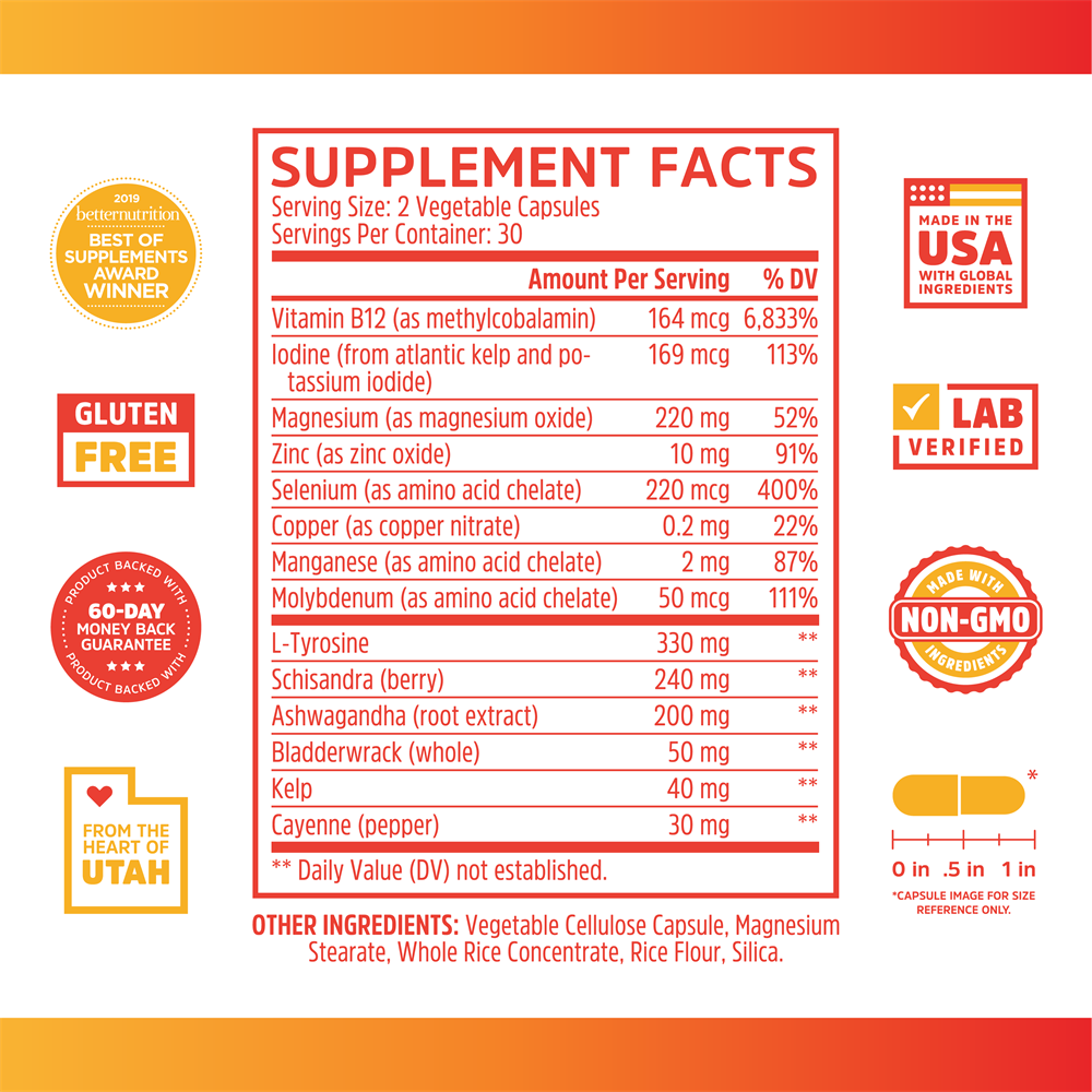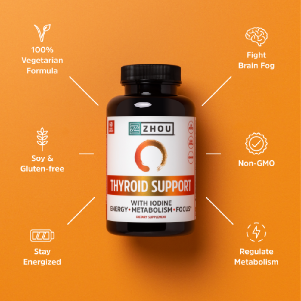 Supports Focus and Clarity. Clear mental fog and boost focus when the thyroid is supported. Increase productivity and conquer daily tasks with ease. Wake Up Rested and Energized. Our Thyroid Support supplement is formulated with iodine to give the thyroid gland the nutrients it craves, helping wake up more rested and energized. Clean Formula for Men and Women. Vegetarian-friendly, gluten-free, soy-free, non-GMO formula contains an all-natural blend of vitamins, minerals, herbs, and amino acids crafted by experts in modern nutritional science. Based in the heart of Utah. Zhou uses only the highest-quality ingredients in a facility following GMP (good manufacturing practices). We test everything at our lab in Utah to ensure confidence in safety and efficacy. Truth. Trust. Transparency. At Zhou Nutrition, we test all our ingredients at intake as well as all of our finished products to ensure you’re getting exactly what we promise, and nothing more or less.