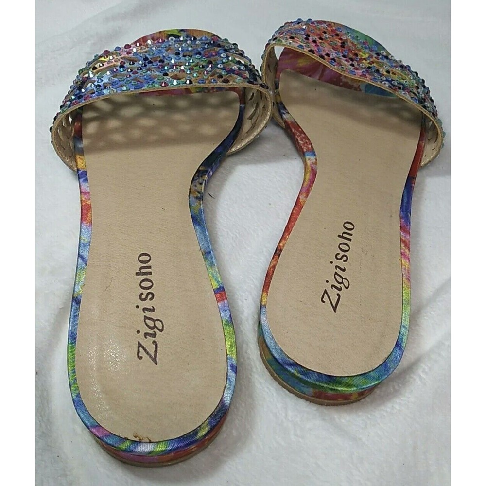 Pattern: Rhinestoned Criss Cross Insole Material: Synthetic Toe Shape: Open Toe Season: Spring, Summer US Shoe Size: 9 Outsole Material: Synthetic Type: Sandal Brand: Zigi Soho Accents: Rhinestone, Zipper, Thong Upper Material: Faux Leather Heel Height: Flat (Under 1 in) Features: Breathable, Lightweight, Back Zipper, Caged Model: Taniya Product Line: Zigi Soho Womens Melaa Rhinestone Closure: Slip On gtin13: Does not apply Color: Jewel Tones w/ Sparkle Heel Style: Flat UPC: Does not apply Lining Material: Synthetic Seller Notes: “Excellent Condition” Shoe Width: M Style: Flat Sandal Theme: City, Clubwear, Modern, Sparkle, Party, Fun Character: Mermaid Occasion: Casual, Party/Cocktail Department: Women