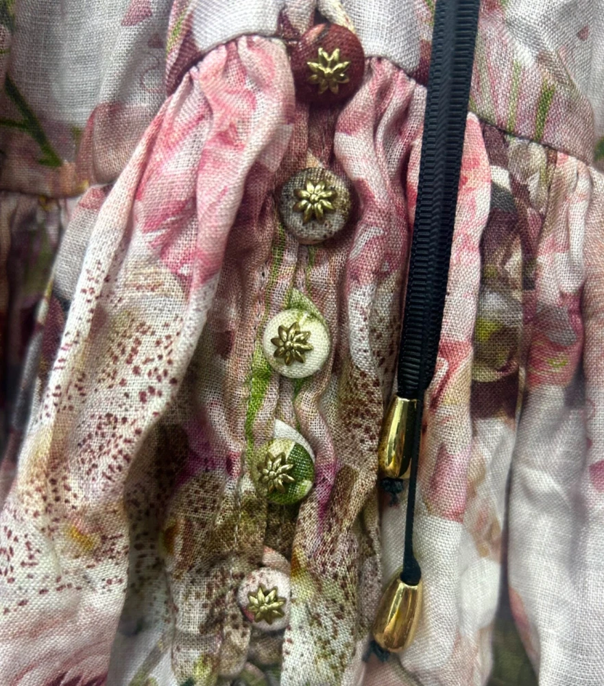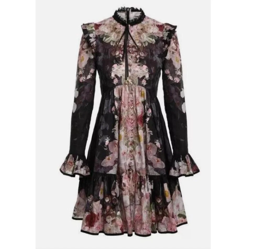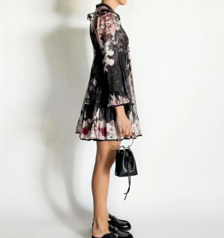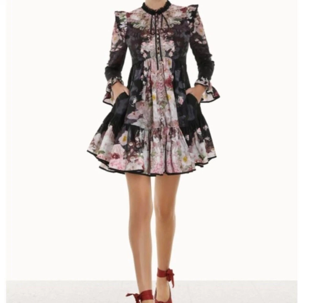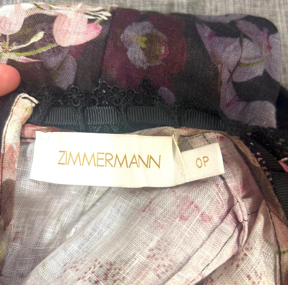 Zimmermann Black & Pink Floral Tie Neck Dancer Mini Linen Dress Size OP The Dancer Tie Neck Mini in Black Garden Floral A linen mini dress in a black with pink and cream garden motif, featuring an empire waist, straight sleeves with fluted cuffs, frills at collar shoulders and hem. Also features an adjustable velvet lace neck tie and a dropped hem 100% Linen Size OP Pls refer to brands offical website for more details on their sizing Fitted bodice Relaxed skirt with frill hem Frills throughout Flower studded button and loop closure down centre front Fabric covered buttons Black lace semi high neckline Velvet adjustable neck tie (can be tied in pussy bow) Contrast stitching throughout Pockets either side Fully lined Excellent condition If you have any questions or require more details, photos ect pls don’t hesitate to msg me Pls check out my other listings - am open to reasonable offers (no low balls pls) and happy to combine postage #designer #australian #alemais shona joy alice mccall acler aje spell