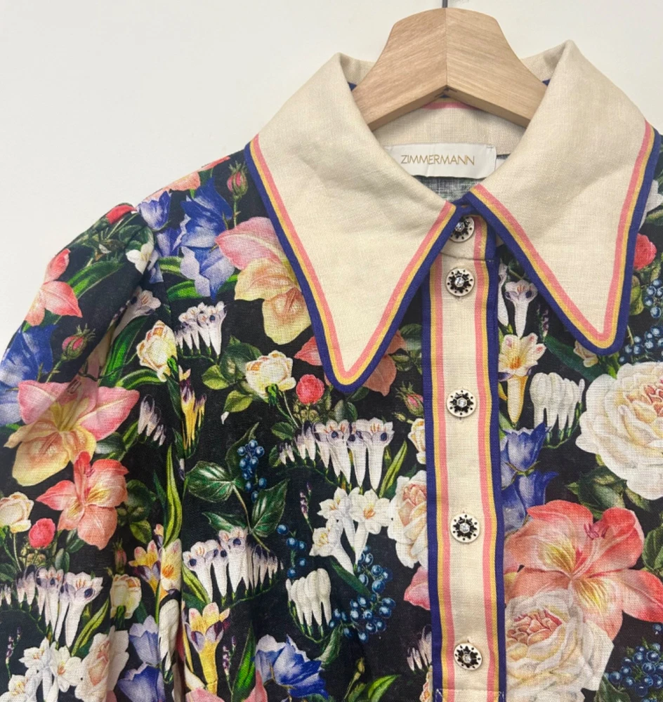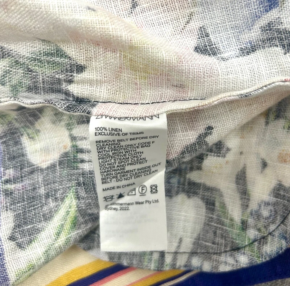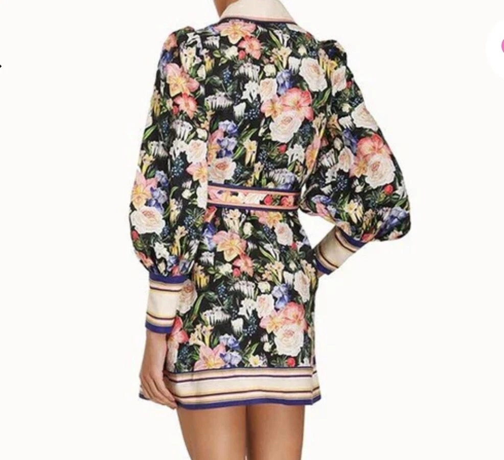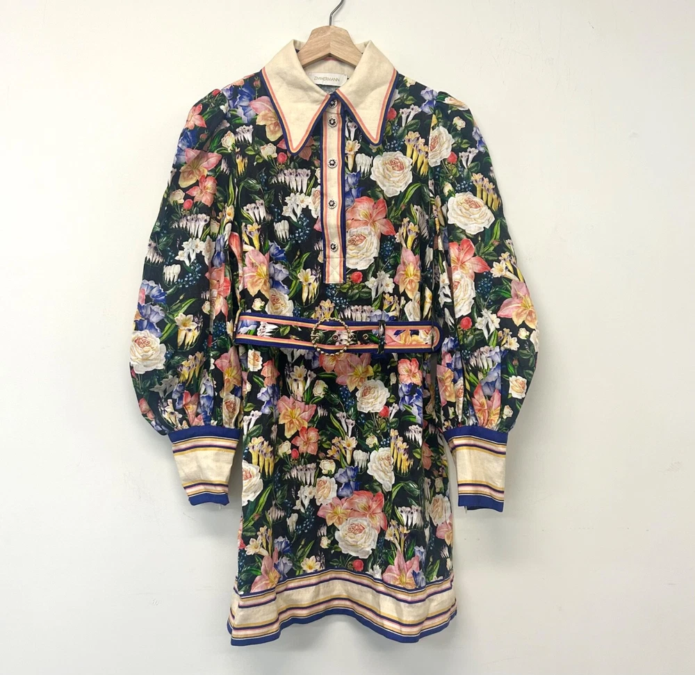 Zimmermann Coaster Long Sleeve Tunic Dress The Coaster Long Sleeve Tunic in Mayflower Black Print from the Spring 2023 Collection, Wonderland. A mini dress featuring a classic collar, blouson sleeves and a placement print throughout Size 2 (Aus/UK 12, US 8) Linen mini dress Floral tropical style print Contrast collar, hem and cuffs Elongated zip cuffs Removable self covered belt with gold circle buckle Excellent condition If you have any questions or require more details, photos ect pls don’t hesitate to msg me Having a MASSIVE clear out ATM so take a sec to check out my other listings - am open to reasonable offers (no low balls pls) and happy to combine postage #designer #australian #alemais shona joy alice mccall acler aje spell