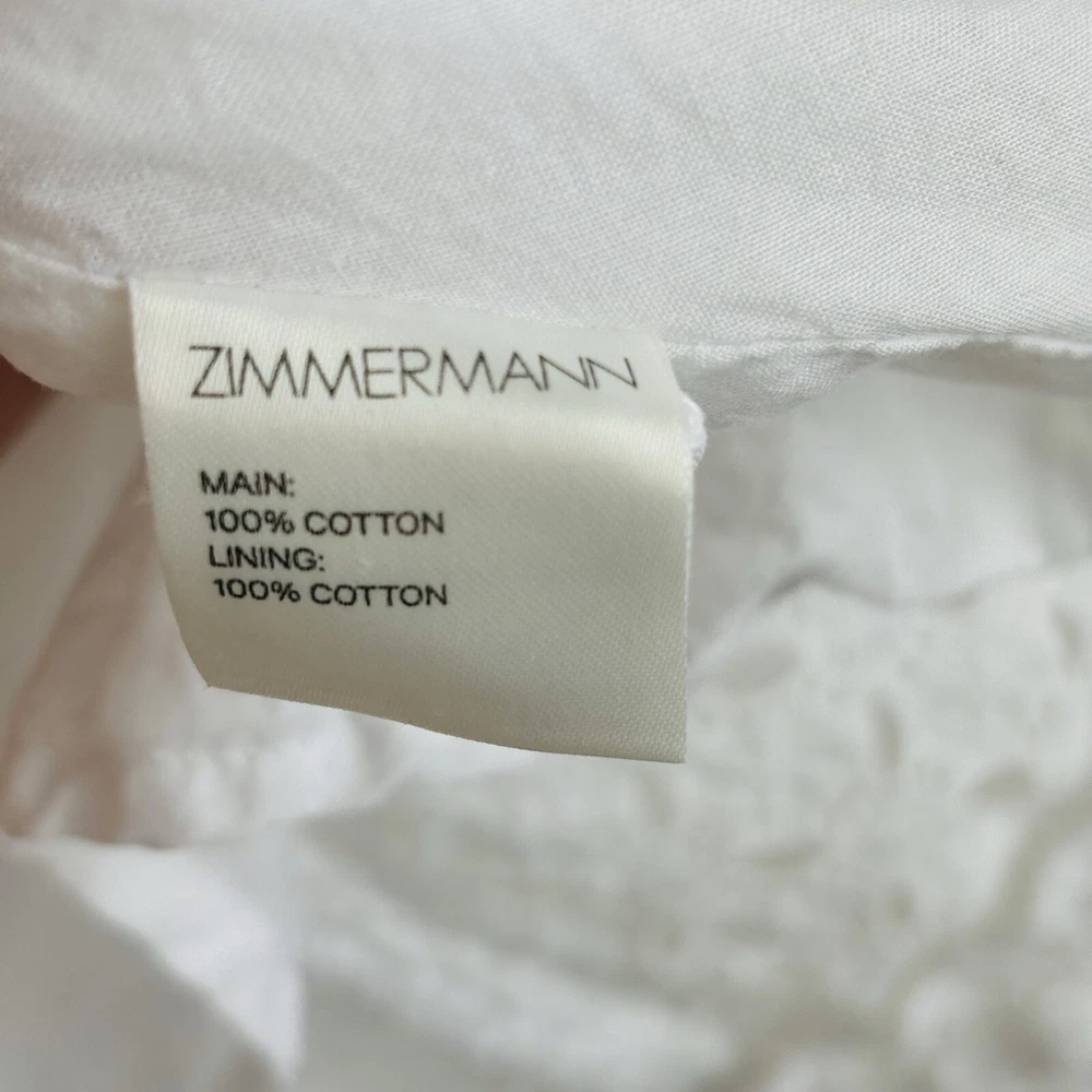 Brand: ZIMMERMANN Seller Notes: “Excellent pre-owned condition.” Pattern: Floral Season: Autumn, Spring, Summer, Winter Sleeve Length: Long Sleeve Vintage: No Fabric Type: Broderie Size: 10 Department: Women Dress Length: Short Colour: White Neckline: V-Neck Size Type: Regular Occasion: Formal, Holy Communion, Party/Cocktail, Travel, Wedding Style: Fit & Flare Material: 100% Cotton Closure: Zip