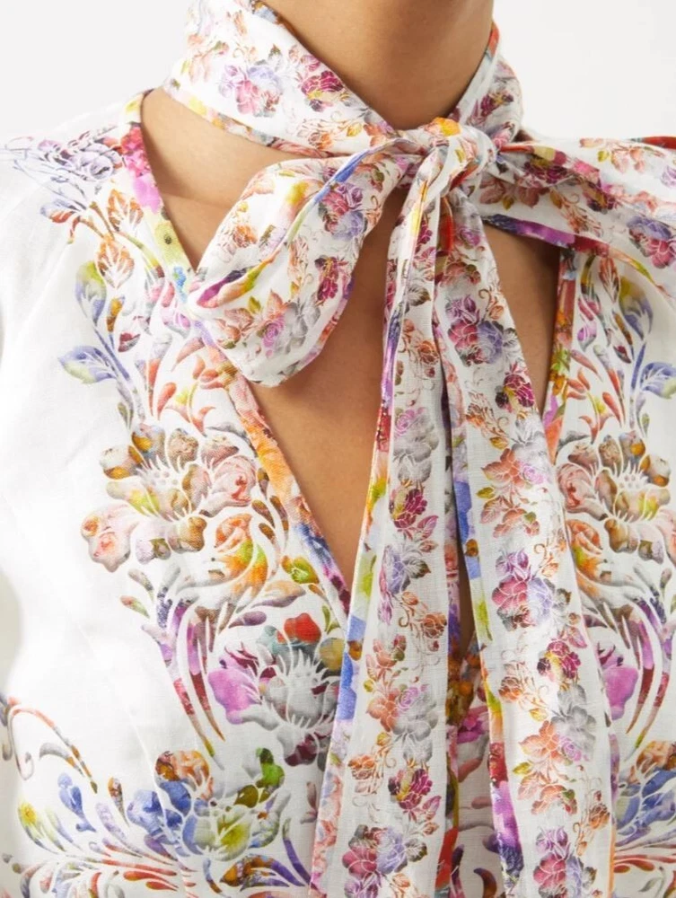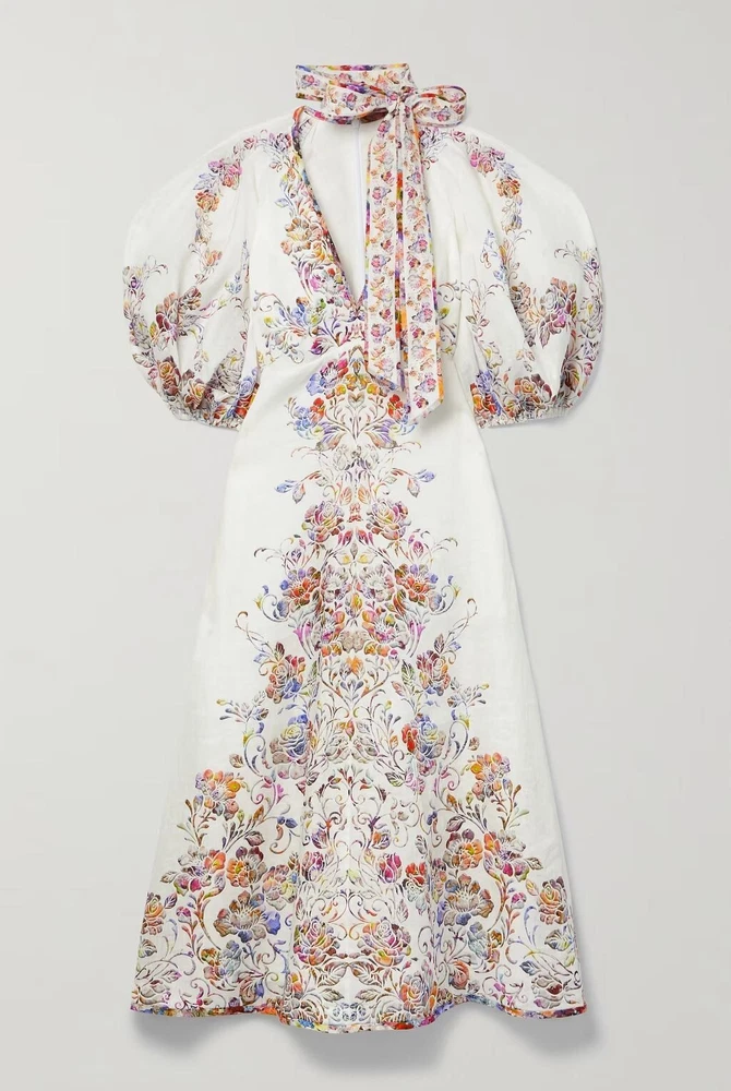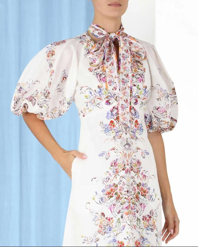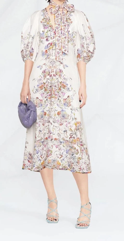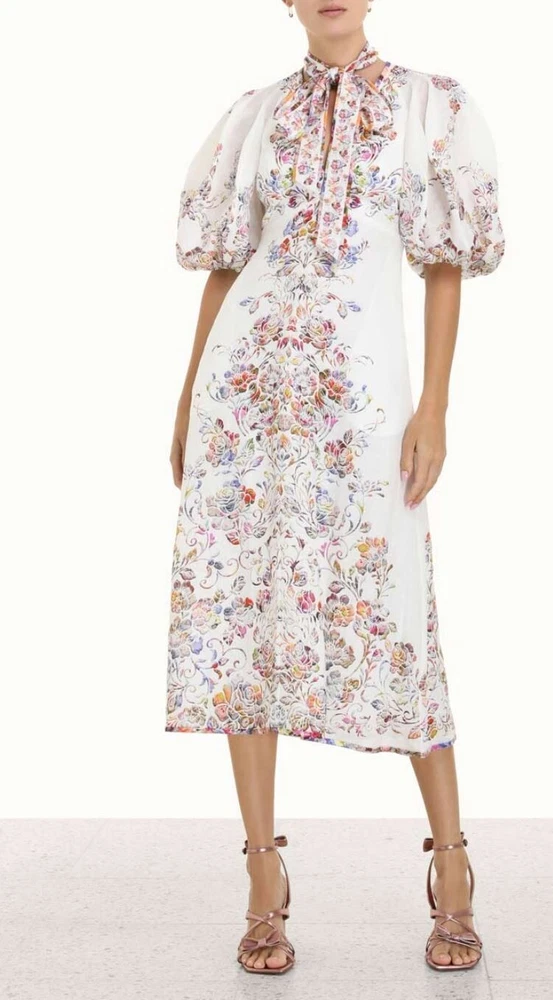 From Zimmermann Spring ‘22 “The Dancer” collection, this ‘Prima Day’ midi dress is made from linen patterned with colorful painterly blooms. It’s designed in a floaty silhouette with voluminous puffed sleeves. The removable neck tie brings a romantic finish. Brand new with tags. COLOUR: White COMPOSITION: 100% linen. CARE: Dry clean Lightweight floral-print linen V-neck, balloon sleeves Concealed zip, side pockets