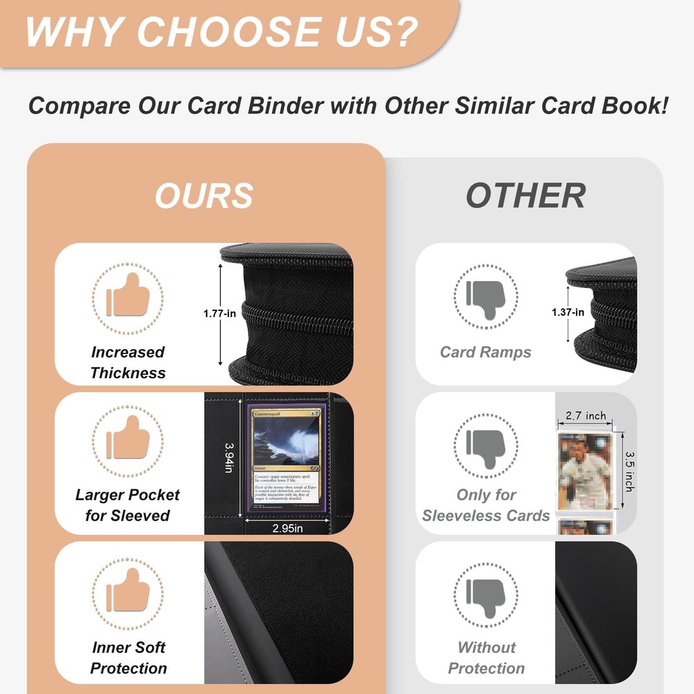 9 Pocket Card Binder: With 24 double-sided card pages, our trading card binder offers a whopping 432 card slots for maximum storage. Whether you're a serious card collector or simply need a place to organize your collectible cards, this card album provides ample room for all your needs. Archival Safe & Premium Quality: Made from high quality material, the 9 slot binder pages are designed to be sturdy and reliable. So your trading cards are well protected and won't be damaged during use. You can rest assured that your cards are in safe hands with this card binder book. Standard Size Fits the Most: Each side loading pocket fits a standard 2.5 x 3.5 inch card. The best storage solution that won't break the bank. TCG/CCG/LCG/MTG/sports trading card with penny sleeve or matte sleeve. Please take a few minutes to loosen the spine before fully loading the binder. Easy to Use and Versatile: Whether you have bare cards, single-sleeved cards, or double-sleeved cards, this 9 pocket card binder can accommodate them all. Easily insert and remove cards without any fear of damage, ensuring a seamless user experience. Premium : With our commitment to excellence, we offer worry-free after-sales service. If you encounter any issues or have any questions about the zipper card binder, our team is here to assist you promptly and professionally.