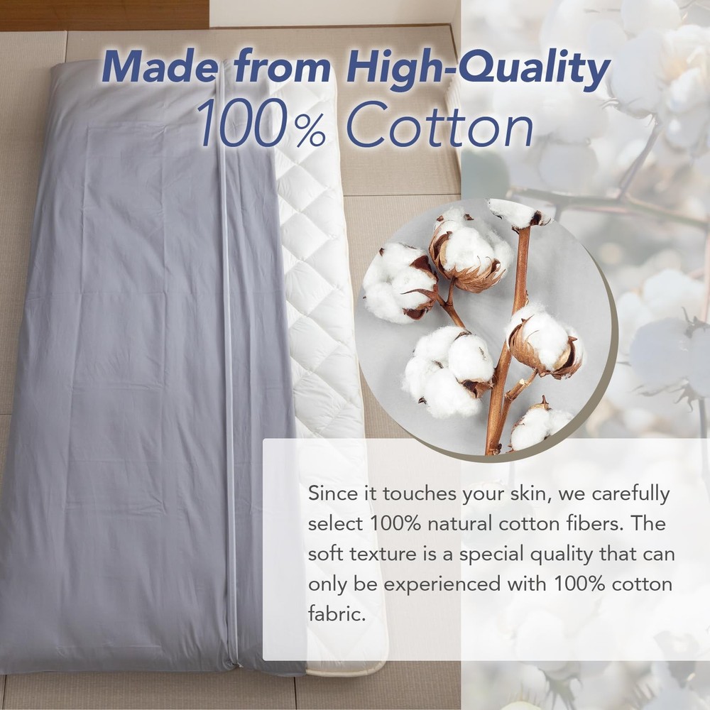 This cotton mattress cover, made in Japan, offers a soft and comfortable feel. Its natural fibers ensure excellent moisture absorption, making it perfect for varying seasons. Cotton’s ability to retain heat while also being breathable makes this cover ideal for year-round use. Machine washable and gentle on the skin, this cotton cover is perfect for those who value comfort and functionality. *Avoid tumble drying to maintain its quality and prevent shrinkage. Experience the Comfort of Japanese Cotton | This cotton mattress cover, made in Japan, offers a soft and comfortable feel. Its natural fibers ensure excellent moisture absorption, making it perfect for varying seasons. High-Functionality Cotton Cover | Cotton’s ability to retain heat while also being breathable makes this cover ideal for year-round use. Easy Care and Skin-Friendly | Machine washable and gentle on the skin, this cotton cover is perfect for those who value comfort and functionality. *Avoid tumble drying to maintain its quality and prevent shrinkage. Size: Queen / Product Size: 61" x 80" / Packing Size: 9.9" x 13.1" x 1.6" / Weight: 1.5 lbs. / Thread Count: 205 is a Japanese textile trading company with a history of 350 years. We offer products that blend Japanese tradition with modern needs, providing integrated services from spinning, weaving, knitting, dyeing, to sewing.