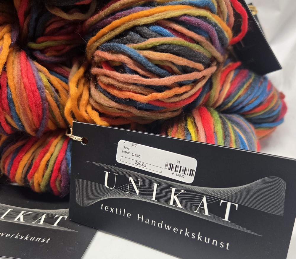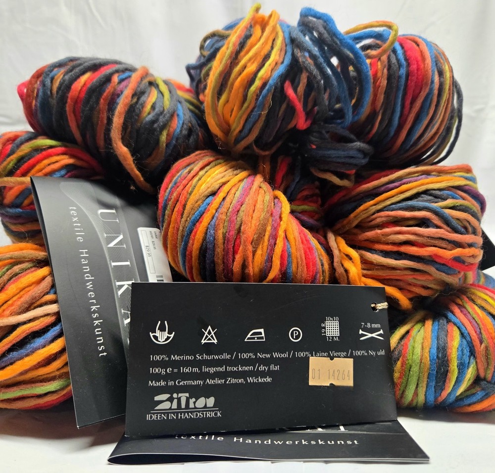 Style: Self-Striping Shape: Skein Weight: 5 - Bulky/Craft Product Line: Unikat Textile Brand: Zitron Fiber Content: Merino Wool Color: Multi-Color Type: Luxury Yarn Country of Origin: Germany Unit of Sale: Lot Suitable For: Accessories - Scarves, Accessories - Gloves/Mittens, Accessories - Hats, Accessories - Bags/Purses, Accessories - Socks, Apparel/Textil, Blankets/Throws, Crafts, Crochet