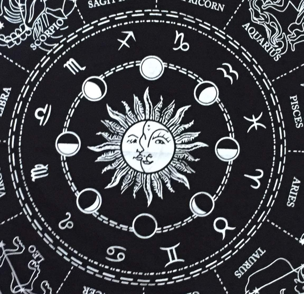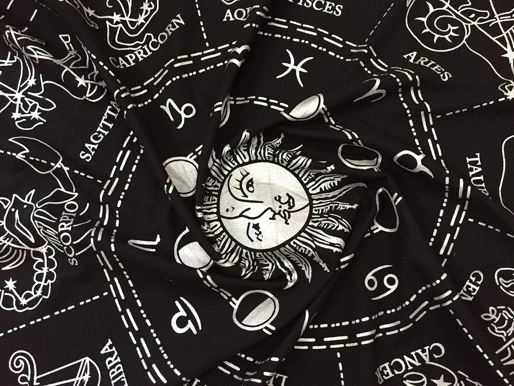 100 % Cotton Duck Cloth for perfect Alter / Altar Tablecloth Silver Color to indicate Zodiac, Astrology, Sun-sign & Tarot Reading are Screen Printed Manually & Fringes on all the 4 Sides of Cloth Wash Care of This Witchcraft : Home Wash, Wash in cold water only, Line Dry in Shade, Iron Warm on Reverse Export Quality By INDIAN CONSIGNERS (Witchery Cloth / Tablecloth Specialist) This Zodiac Wicca Cloth is Traditionally Made with Indian Artists {MADE IN INDIA} Product Description Tarot reading Cloth Sun Face With Phases Of Moon The Moon represents powerful feminine energy . It signifies wisdom, intuition, birth, death, reincarnation, and a spiritual connection. Moon cycles are similar to the cycle of a seed: the seed grows into a flower, then blooms, and then dies Available in 3 Sizes 45 by 45 CMS/18x18 inches 61 by 61 CMS/24x24 inches 91 by 91 CMS/36x36 inches Zodiac Astrology Your sun sign describes your basic nature and the personality traits that remain constant through the ups and downs of life. ... The sun sign describes the particular way that you're vital or powerful in life. For example, those with the sun in Cancer are known to be homebodies Upper Left Corner Upper Right Corner Lower Left Corner Lower Right Corner