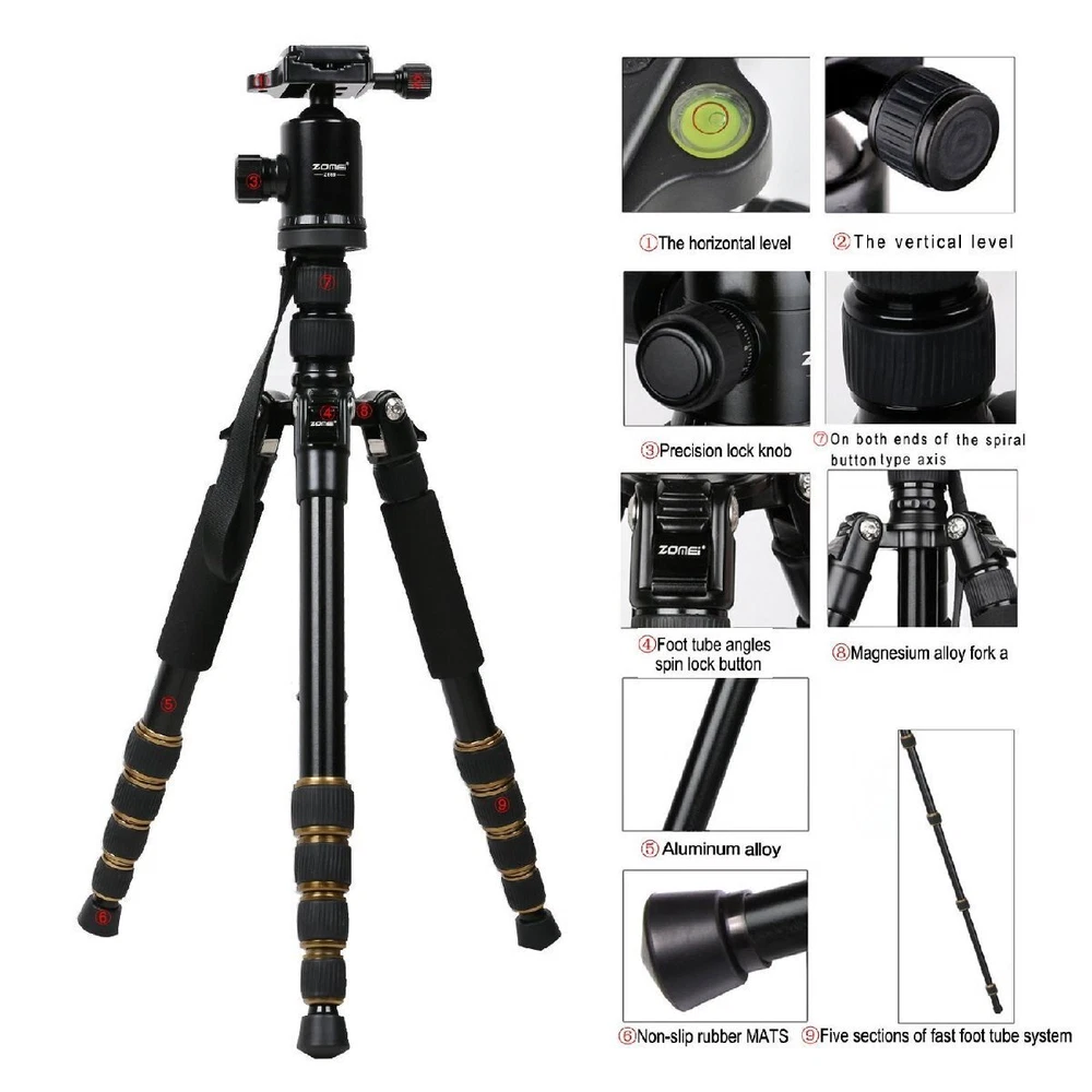 Zomei Z669 Magnesium Aluminum Alloy Travel Camera Tripod with Ball Head for Canon Sony DSLR SLR Cameras Item Description 2 IN 1 TRIPOD: 2 IN 1 tripod that transforms into a full size monopod by screwing on the center pole and detachable tripod leg. COMPACT & LIGHTWEIGHT: The tripod legs can be flipped 180 degrees and folded back, with a compact size of 13.8 inches, it saves space and is small enough to carry anywhere. It weighs only 3.62 lbs, perfect for indoor and outdoor photography. DURABLE & STRONG: The maximum load of this tripod is 28.66LB 13KG , so it can hold your DSLR camera and other gears safely. PORTABLE & CONVENIENT: It is convenient for travel and comes with a padded carrying case with a good shoulder strap for protection Payment Shipping Return Policy International Buyers Please Note Import duties, taxes, and charges are not included in the item price or shipping cost. These charges are the buyer's responsibility. Please check with your country's customs office to determine what these additional costs will be prior to bidding or buying.