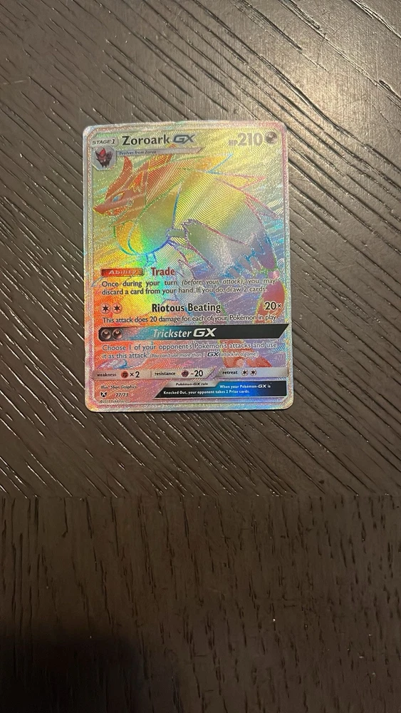The product is a Zoroark GX Pokémon card from the Shining Legends set, specifically a Secret Rare version with a holographic finish. This Stage 1 Pokémon card has 210 HP and falls under the GX specialty category. Produced by The Pokémon Company, it is card number 77 out of 73 in the set and is in English language. This collectible card game item is highly sought after by Pokémon TCG players and collectors due to its rarity and special attributes.