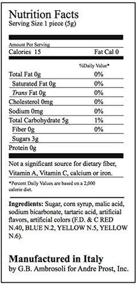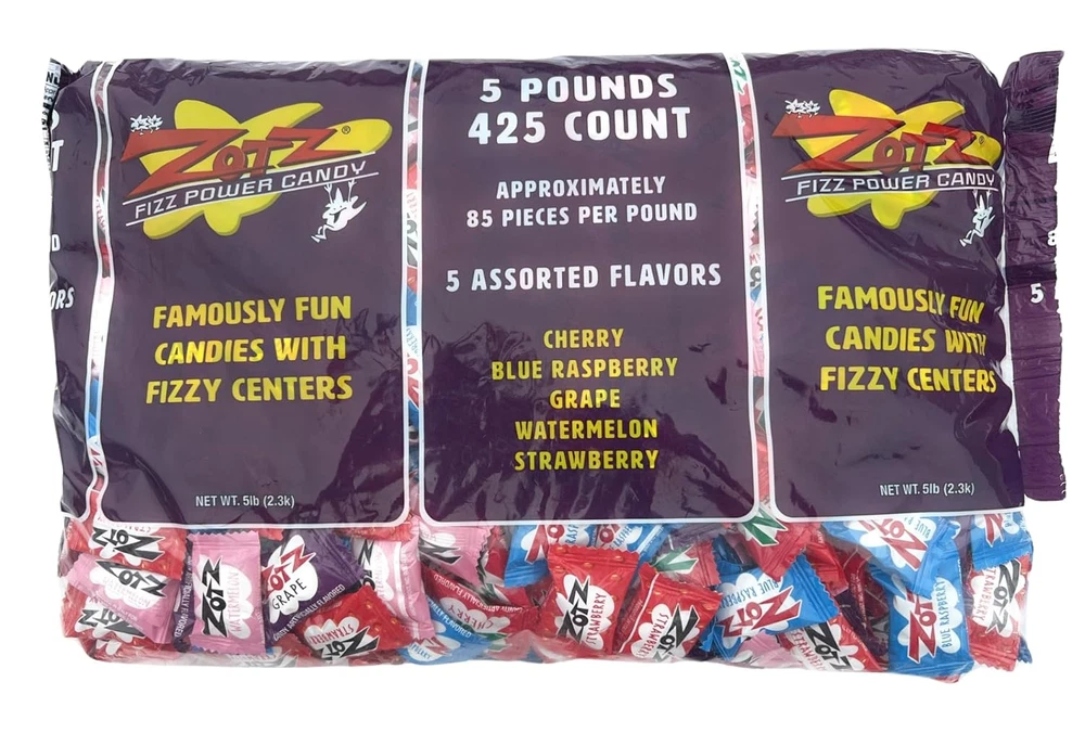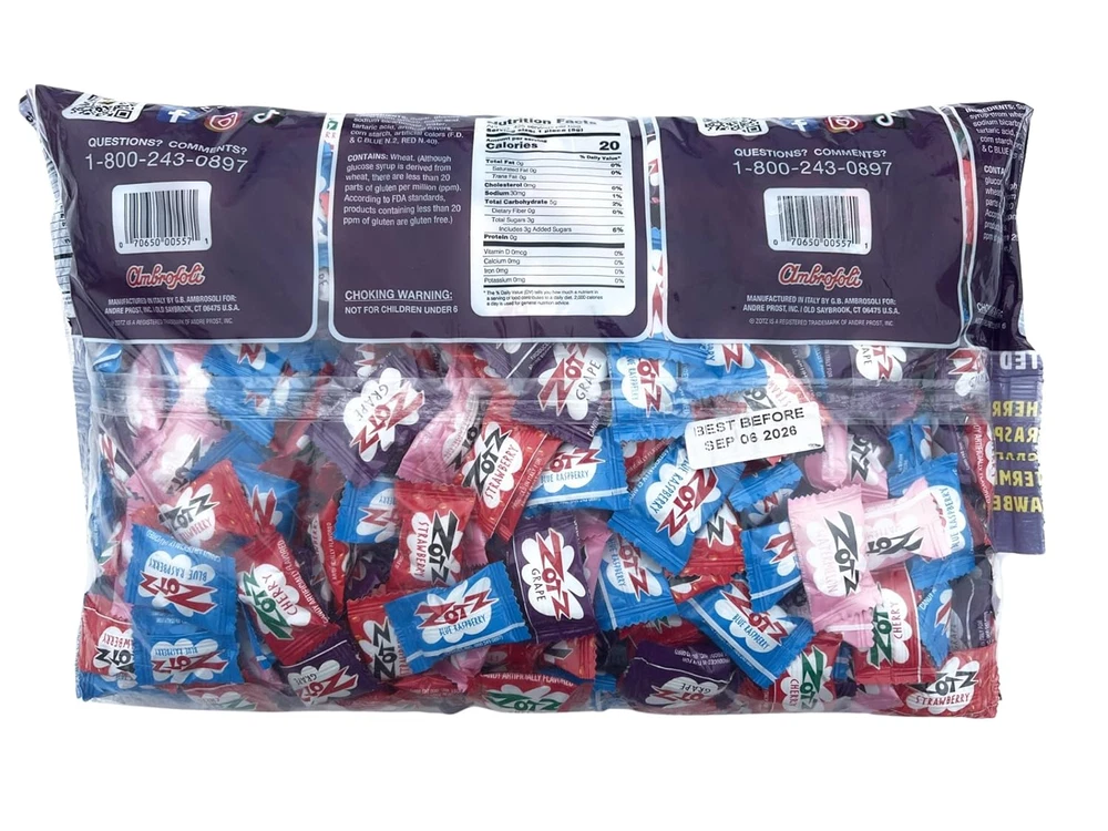 Store New Arrivals Add to Favorite View Feedback Contact Zotz Fizzy Bulk Candy (Assorted, 425 Units)- Hard Candy Individually Wrapped- Assorted Fruit Flavors, Cherry, Watermelon, Strawberry, Blue Raspberry, Apple, Orange & Grape- from Italy since 1970 Description Item model number 557 Unit Count 80.0 Ounce Number of Items 1 Is Discontinued By Manufacturer No Product Dimensions 14.5 x 9.75 x 3 inches; 5 Pounds Flavor Assorted Item Form Candy Brand Zotz Manufacturer Andre Prost, Inc. CLASSIC FIZZY CANDY SINCE 1970 – Indulge in the original Zotz Fizzy Candy, crafted with the same iconic recipe for over five decades. Each piece delivers a burst of nostalgic flavor with a unique fizzy surprise in the center. SWEET & SOUR DELIGHT – Enjoy the perfect balance of a sweet hard candy shell and a tangy, fizzy center. The addictive combination of flavors makes it hard to stop at just one! ASSORTED FRUIT FLAVORS FOR EVERY TASTE – Featuring a variety of flavors, including cherry, watermelon, strawberry, blue raspberry, apple, orange, and grape. There’s something to satisfy every fruity craving! INDIVIDUALLY WRAPPED FOR CONVENIENCE –Each candy is individually wrapped for freshness and easy sharing. Perfect for parties, goodie bags, or everyday treats. A FUN TREAT FOR ALL OCCASIONS – Whether for Halloween giveaways, party favors, or just reliving childhood memories, Zotz candies bring fun and fizz to every moment. Share joy with kids and adults alike! The original fizz power candy is just like you remember it- delicious hard candy with a sour fizz in the middle. Zotz fizzy candy - where the fizz izz! ingredients: sugar, corn syrup, malic acid, sodium bicarbonate, tartaric acid, artificial flavors, artificial colors (f.D. & C red n.40, Blue n.2, Yellow n.5, Yellow n.6). ABOUT US We offer the best prices around on high quality products. Our E-store includes media such as books, movies, music and games while offering electronics, toys, sporting apparel, clothing, tools, general home, garden items and more. SHIPPING We are always working hard to ensure your package arrives as soon as possible. Please understand that some factors like weather, high postal traffic, and the performance of shipping companies are outside of our control. We offer free shipping to the lower 48 states and ship within 2 business days of payment, usually sooner. We do not accept P.O. Boxes. Please provide a physical address. RETURNS We offer a 30-Day Return Policy on items which you are not completely satisfied with. You have the option for a full-refund or an exchange of the item. No returns are available on items shipped outside of the USA. PAYMENT We accept PayPal. CONTACT US This page content is yet to come Please ad us to your favorite seller and visit again later Thank You CUSTOMER SATISFACTION We try our very best to make sure every customer is completely satisfied. If there's a problem, message us! We're happy to help.