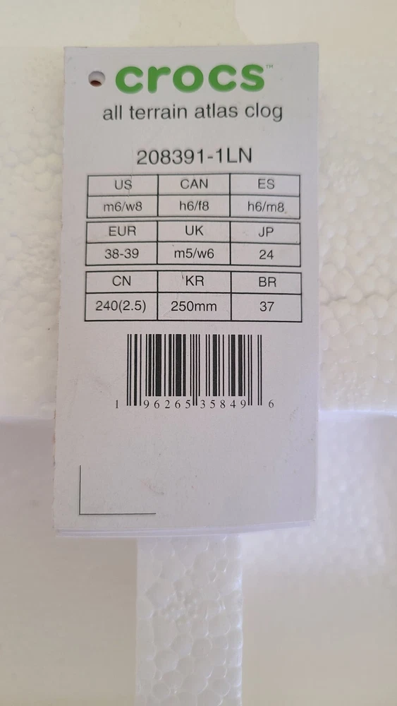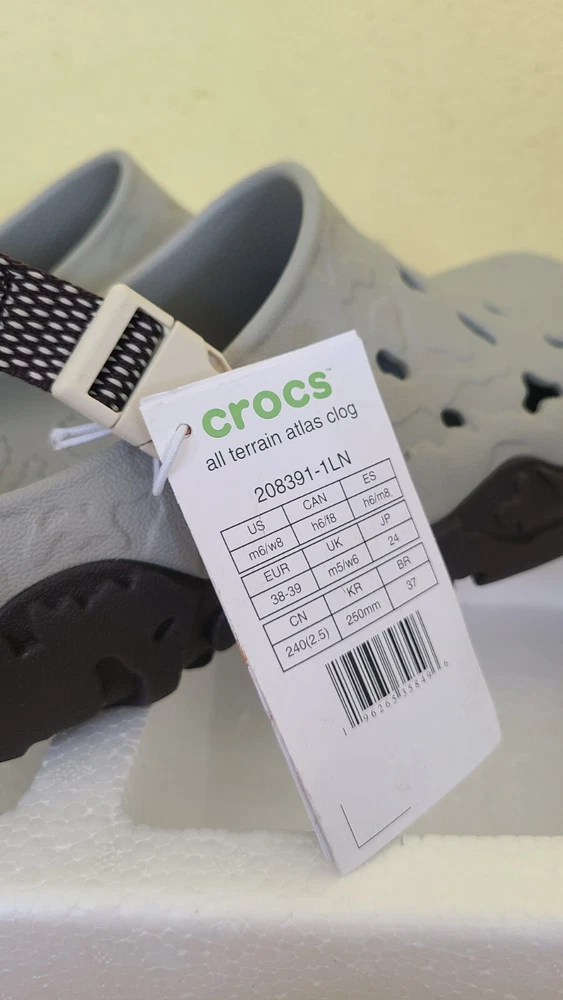 UPC: 196265358496 Vintage: No Upper Material: Croslite Accents: Logo Closure: Slip On UK Shoe Size: M5/M6 gtin13: 196265358496 Department: Men Customized: No Color: Elephant/Multi Season: Fall, Spring, Summer Brand: Crocs Product Line: Crocs All Terrain Atlas Clog Country/Region of Manufacture: Vietnam Style: Clog Type: Casual Model: All Terrain Atlas Clog AU Shoe Size: N/A EU Shoe Size: 36-38 Outsole Material: Rubber Shoe Width: M MPN: 208391-1LN Occasion: Casual, Travel US Shoe Size: M4/W6 Insole Material: Croslite Character: N/A Estado del artículo: Nuevo sin caja Toe Shape: Round Toe Fabric Type: N/A Lining Material: Croslite Features: Comfort, Lightweight Theme: N/A Pattern: Solid
