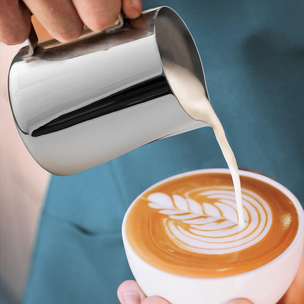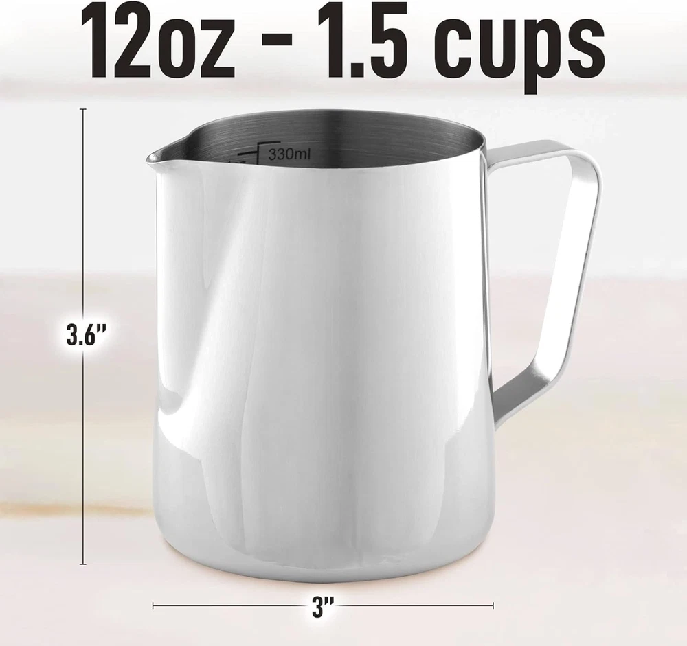 Zulay Milk Frother Cup 350ml/600ml/950ml 12 oz - 350 ml, Silver Product Details Brand: Zulay Kitchen Material: Stainless Steel Color: Silver Capacity: 12 ounces Special Feature: Laser Welded Ergonomic Handle Style: Modern Product Dimensions: 3"W x 3.6"H Included Components: Laser Welded Ergonomic Handle Material Feature: Rust-resistant Shape: Rectangular prism Item Weight: 150 Grams Model Name: Frothing Pitcher With Lid: No Item Weight: 5.3 ounces Manufacturer: Zulay Kitchen Item model number: SYNCHKG107214 Is Discontinued By Manufacturer: No EASY TO READ MARKINGS: This milk frother pitcher is designed with oz and ml markings on the inside, making measuring liquids a lot more convenient. This frother cup is made of food-grade and rust-resistant 304 stainless steel, so you can make perfectly portioned lattes or cappuccinos for years to come. GREAT GIFT FOR COFFEE LOVERS: Surprise coffee enthusiasts with our milk steamer cup. This frothing cup makes a perfect present for birthdays, holidays, special occasions, Christmas, Mother’s Day, or Father’s Day. This milk steaming pitcher brings the charm of a coffee shop into the home. This milk frothing cup allows anyone to create beautiful latte art, ensuring every cup is a work of art. Give the gift of coffee perfection and elevate their coffee to new heights with our milk frothing jug. EASY TO CLEAN: Clean this espresso milk frothing pitcher by running it under hot water with a little soap to get rid of any milk residue. Even after multiple washes, our milk pitcher for espresso machine will look as good as new and ready to add an artistic touch to your coffee. Get this stainless steel milk frothing pitcher for your friends or take it with you on trips to easily create delicious coffee drinks.