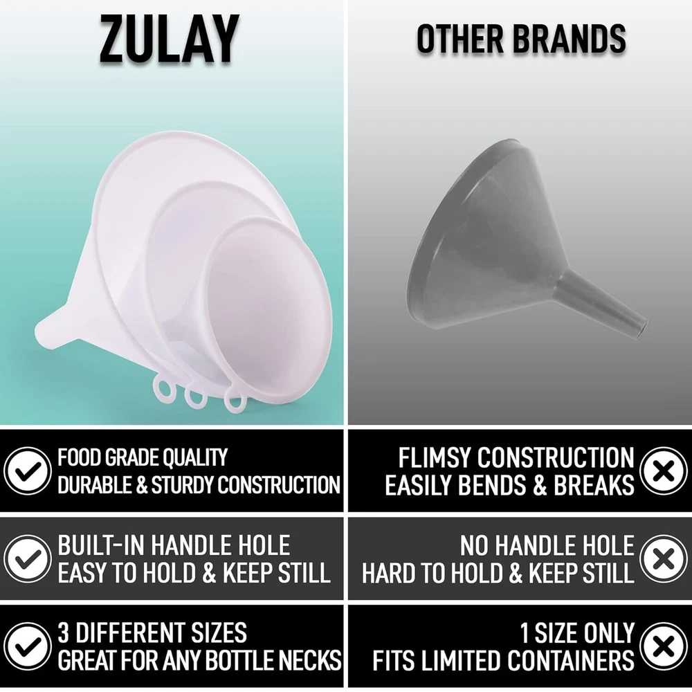 Zulay 3-Pieces Plastic Funnel Set - Large, Medium, and Small Kitchen White Product Details Is Discontinued By Manufacturer : No Package Dimensions : 4.92 x 4.57 x 4.33 inches; 1.13 ounces Item model number : Plastic Funnel Set Manufacturer : Zulay Kitchen Material: Plastic Brand: Zulay Kitchen Color: White Manufacturer: Zulay Kitchen 3-PIECE KITCHEN FUNNEL SET: Transfer dry or liquid ingredients while keeping the kitchen counter free from spills with these funnels. Available in three different sizes, these large mouth funnels can also be used in a chemistry lab, in restaurants, or anywhere you’d need a precise transfer. FASTER POURING: Designed with a cone shaped structure and narrow spout, these food funnels can easily fit into smaller containers and narrow bottles. The wide brim mouth makes it quick to pour ingredients like oil, juice, spices, coffee grounds, and even tea leaves. DURABLE MATERIAL: This oil funnel set is made of high-quality plastic that doesn’t leave any aftertaste and is also suitable for both hot and cold ingredients. These sturdy funnels offer pouring perfection for years to come. EASY TO STORE AND CLEAN: When you are done funneling your way to delicious meals, stack these plastic funnels or use the loops on the side to hang them for storage. These funnels are top-rack dishwasher friendly, providing an effortless cleanup.