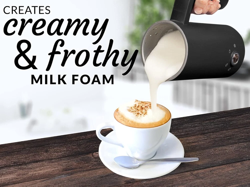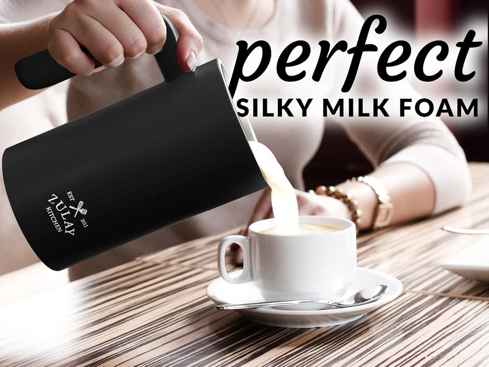 Zulay Kitchen 4-in-1 Milk Steamer - Automatic Milk Frother Electric (10oz/300ml) - Milk Frother and Steamer - Stainless Steel Electric Milk Frother For Latte, Cappuccino, Hot Chocolate (Turbo Black) Brand Zulay Kitchen Special Feature Bpa Free Color Black Material PP, Stainless Steel Product Dimensions 4.21"W x 8"H About this item 4-in-1 MILK FROTHER AND STEAMER: Achieve the desired milk texture with the one-button control functionality of this electric frother. Press once for warm and thick milk froth, twice for warm and less froth, thrice for hot milk with less froth, and four times for cold froth. It can also melt chocolate for hot cocoa or heat up milk for your coffee creations. YOUR OWN COFFEE SHOP AT HOME: Experiment with your coffee creations using our milk steamer. Use it to foam dairy and nondairy milk for lattes, cappuccinos, matcha, hot chocolate, iced coffee, and much more. It has a total capacity of 300ml, and is recommended to fill it up to 150ml when frothing milk. QUICK AND QUIET: Make deliciously creamy froth or heat milk for hot cocoa in seconds without waking anybody up in the morning using our low-noise milk heater. It comes with a transparent lid that provides a secure fit to prevent any spillage. EASY TO CLEAN: This electric frother is designed with a non-stick interior coating that can be rinsed under water easily to get rid of any milk residue. You can use a damp towel to wipe the exterior. Avoid letting any water run down the side near the power base. DURABLE AND SAFE TO USE: This electric milk frother is constructed with a food-grade stainless steel rust-resistant interior and a shatterproof Tritan lid, making it fit for everyday use. The exterior and handle remain cool to keep your hand from burning. This milk frother and warmer is designed to turn off automatically to prevent overheating. HASSLE-FREE, ZULAY GUARANTEE: We are a family owned USA business that believes in providing customers with best-quality products. Our milk foamer is backed with a lifetime warranty. If there are any issues, contact us, and we will always be available to make it right.