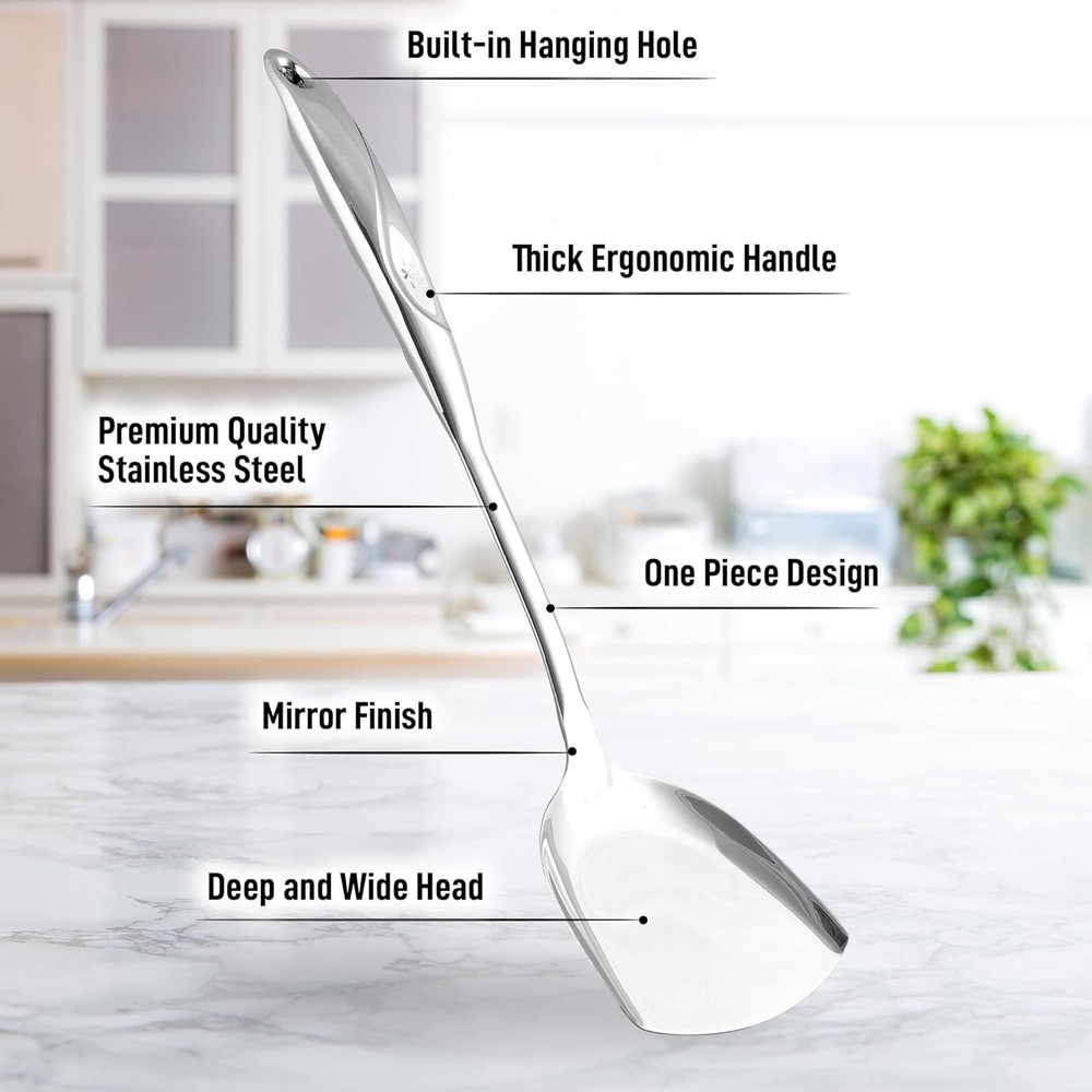 Zulay Kitchen Stainless Steel Metal Wok Spatula - Durable Spatula, Silver Product Details Material: Stainless Steel Color: Silver Brand: Zulay Kitchen Size: Wok Spatula Product Dimensions: 14.8"L x 4"W Item Weight: 0.14 Kilograms Is Dishwasher Safe: Yes Shape: Rectangular Handle Material: Stainless Steel Material Type Free: Plastic Free, Silicone Free, Wood Free Recommended Uses For Product: Cooking in deep woks, Removing food without splatter Manufacturer: Zulay Kitchen Item Weight: 4.9 ounces Country of Origin: China Item model number: SS Wok Spatula Is Discontinued By Manufacturer: No PREMIUM STAINLESS STEEL: An excellent culinary innovation that will give you delicious stir-fry dishes at home. Since most recipes require high amounts of heats, it's essential to get a spatula that's long enough so your hands do not burn. Made from premium quality stainless steel, this 14.8 inches stainless steel long spatula is excellent for cooking in very deep woks to remove food without splatter. Ergonomic handle is designed for a comfortable grip when holding. DURABLE & EASY TO GRIP: This stainless steel wok spatula is stylish, sturdy, and was built with a convenient length that is engineered to prevent oil splash when stir-frying. Durable steel design does not bend at all when turning or lifting heavier foods.The edge on the spatula head is designed to help scoop oil and food during cooking. A MUST HAVE IN EVERY KITCHEN: If you are on the hunt for an inexpensive yet high-quality wok spatula- look no further! It makes a great gift with its classy design to anyone who loves to cook as it easily complements any kitchenware. This product is a truly worthy addition to anyone's arsenal of kitchen cooking utensils. EASY TO CLEAN & STORE: Lightweight and easy to clean. To put it simply, this beautiful mirror-finished stainless steel wok spatula can be washed by hand or in the dishwasher. Includes a built-in hanging hole on the handle for easy storage after use.