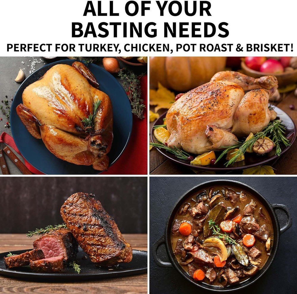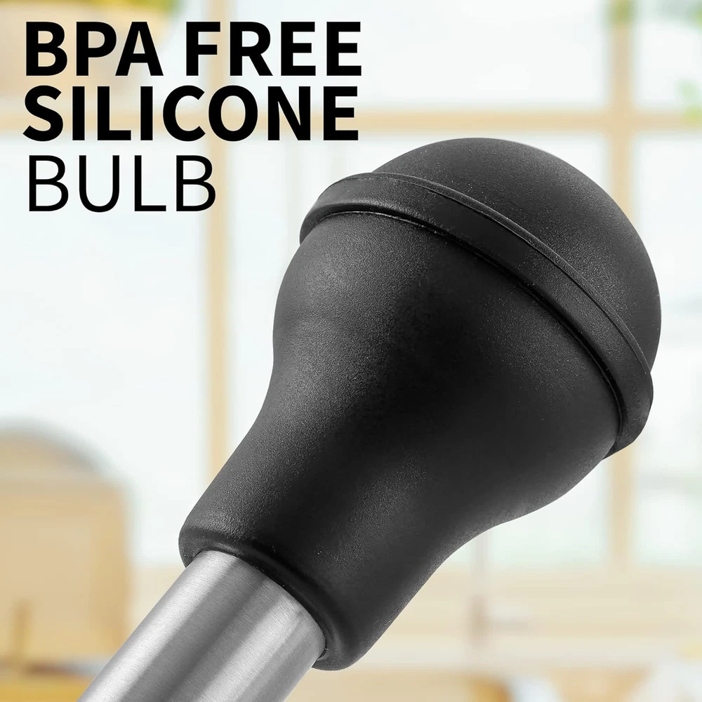 Zulay Kitchen Stainless Steel Turkey Baster for Cooking - Product Details Color: Stainless Steel Brand: Zulay Kitchen Style: Classic Product Dimensions: 10.63"L x 2.17"W Is Dishwasher Safe: Yes Head Material: Stainless Steel Manufacturer: Zulay Kitchen Item Weight: 6.4 ounces Item model number: Stainless Steel Turkey Baster IDEAL BASTER FOR COOKING: Impress your family with a juicy, meaty feast at a family, Thanksgiving or Christmas dinner with our durable turkey baster syringe. Its stainless steel construction allows you to dip the baster in even the hottest meals, while the silicone bulb remains cool to touch (heat resistant up to 450°F). MAXIMUM SUCTION POWER: Our easy-to-hold silicone baster bulb is designed to provide perfect grip; with one single press you can fill up the 5.5 Oz dripless baster with liquid; ready to add more flavor to your meal. TWO UNIQUE NEEDLES: Cook a variety of different meals with the meat & poultry baster that comes with a 2.95-inch precision needle designed to inject thin cuts of meat; and a 2.56-inch angle needle to inject chunky marinades into your food