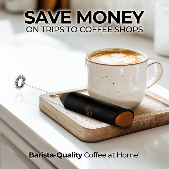 Zulay Powerful Milk Frother Wand - Mini Handheld Black & Copper Product Details Brand: Zulay Kitchen Special Feature: Powerful Motor Color: Black & Copper Material: Stainless Steel Recommended Uses For Product: All Types Model Name: FrothMate Milk Frother Included Components: Stand Not Included Product Care Instructions: Hand Wash Only Style: Mighty Frother Number of Batteries: 2 Number of settings: 2 Power Source: Battery Powered Wattage: 800 watts Manufacturer: Zulay Kitchen Package Dimensions: 9.06 x 1.65 x 1.3 inches Item Weight: 2.89 ounces Country of Origin: China Item model number: FrothMate Milk Frother POWERFUL FROTHING EXPERIENCE: Skip the coffee shop run and enjoy lattes, cappuccinos, matcha, hot chocolate, powdered drinks, or iced coffee at home with this milk frother. With a 13,000 RPM motor and 26 spiral rings, this coffee foam maker turns ordinary milk to frothy perfection in seconds. MATCHA, COFFEE, & MORE: This matcha whisk works better than a manual bamboo whisk for making matcha tea and works just as well for coffee. It is designed to work on all types of milk, such as half and half, soy, almond, oat, cashew, hazelnut, whole milk, low-fat, skim milk, and other dairy items like butter or cream. This also works great as a powder mixer and can even whisk eggs. EASY TO CLEAN AND STORE: This hand frother can be cleaned by placing the whisk under running water and briefly turning it on; wipe the handle with a damp cloth. The compact size of this milk foamer allows it to be stored in kitchen drawers without taking up too much space. SIMPLE TO USE: All it takes is pressing the on/off button to make a cup of frothy latte, mix protein powder, or even whisk up some eggs for a perfect omelet with this electric whisk. Make this drink mixer an addition to your coffee bar, or take it anywhere for a caffeine boost.