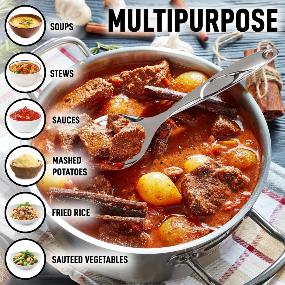 Zulay Kitchen Stainless Steel Serving Spoon - Large Cooking - Silver Product Details Number of Pieces: 1 Is Dishwasher Safe: Yes Material Type Free: Other Materials Free Product Dimensions: 11.5 x 3 x 0.01 inches Item Weight: 4.2 ounces Manufacturer: Zulay Kitchen Country of Origin: China Item model number: Serving Spoon Is Discontinued By Manufacturer: No Color: Silver Material: Stainless Steel Brand: Zulay Kitchen Style: Cooking Spoon Product Dimensions: 11.5"L x 3"W STURDY STAINLESS STEEL: From an intimate family dinner at home to a large gathering in your backyard, the Zulay Kitchen Serving Spoon has got you covered! Made with top-grade stainless steel that is durable, sturdy, and long-lasting. Its polished mirror finish provides a smooth texture with no rough edges giving this tool an elegant look that matches any kitchen utensil set. COMFORTABLE HANDLE: The handle is designed with a curve that lets you hold the spoon in a way that fits your hand comfortably, allowing you a manageable serving experience each time. WIDE SPOON BOWL: Its dimensions of 11.5 x 3 inches and thickness of 3mm is strong and wide enough to hold more food in one scoop. Perfect for the holidays, birthdays, outdoor activities, dinner parties, and more. SUPER EASY TO CLEAN: Smooth surface and stainless steel structure make it easy to clean and maintain. Simply wash with soap and water. Dishwasher friendly. Easy to store, simply hang on a utensil hook holder or store in a drawer.