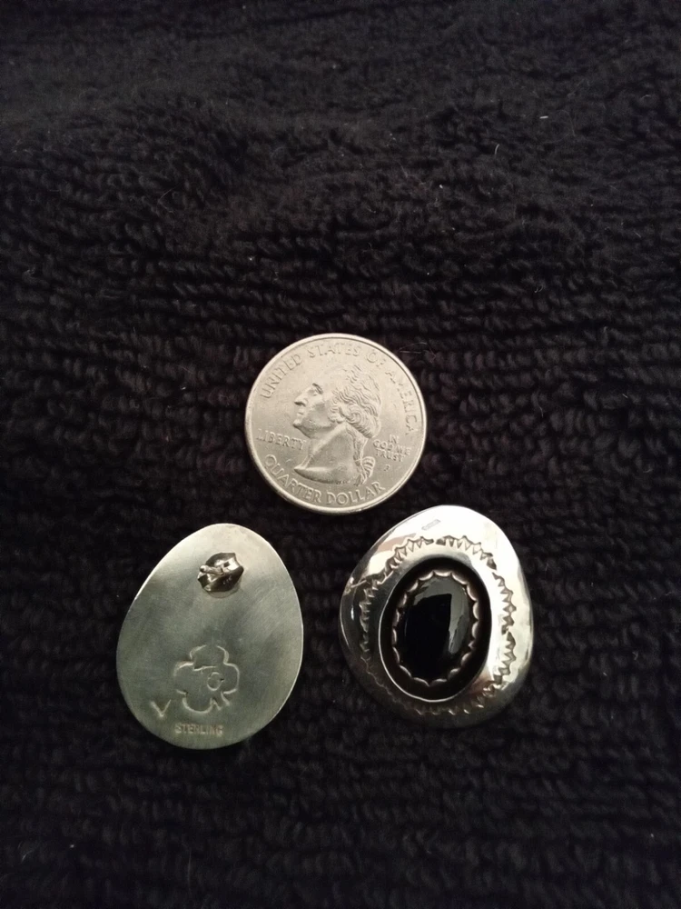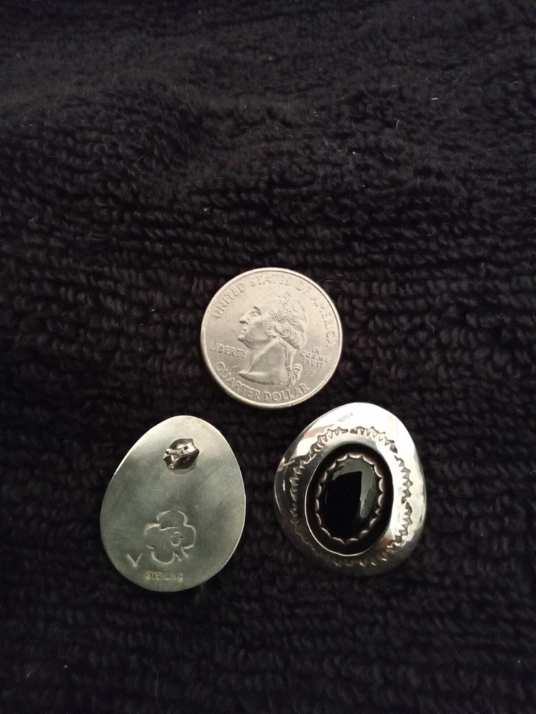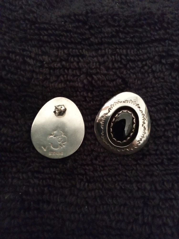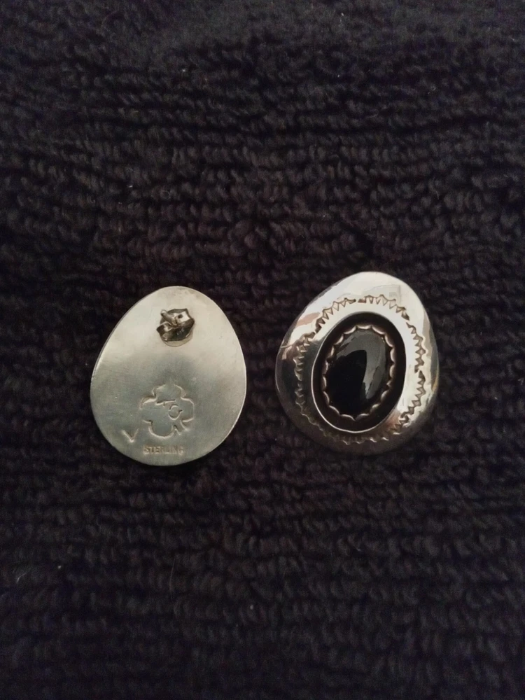These Zuni Native American earrings feature black onyx stones set in sterling silver. They are earrings for the lobe. The earrings are vintage and signed by the maker. The style is handmade with a bezel setting, showcasing the oval black onyx stones. This authentic Native American jewelry is a stunning addition to any collection.