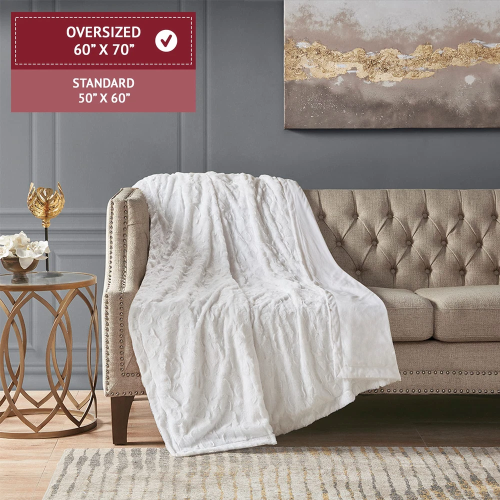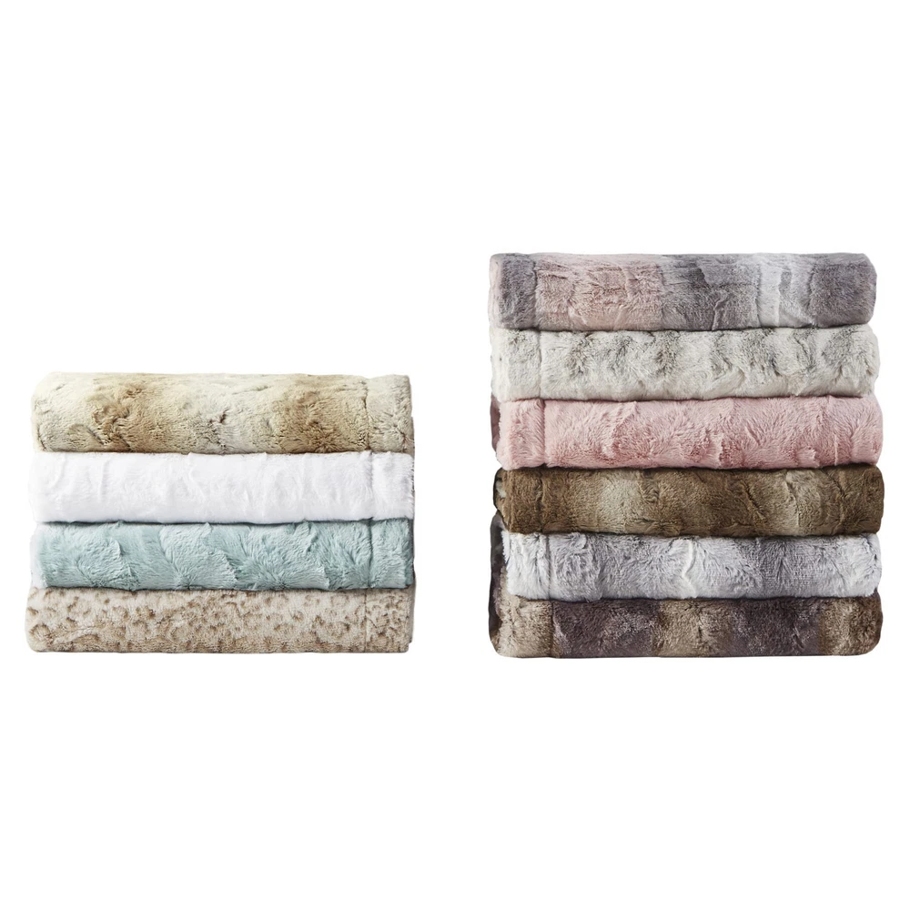 The Zuri oversized throw features a luxuriously soft faux fur and reverses to a solid faux mink. This faux fur throw is the perfect modern update and adds a glamorous accent to your home. This throw is machine washable for easy care and OEKO-TEX certified, meaning it does not contain any harmful substances or chemicals to ensure quality comfort and wellness. The Zuri Blanket features a luxuriously soft faux fur and reverses to a solid luxe microfur. A warm blanket and a glamorous accent to your home with ’s Zuri Oversized Faux Fur Throw. Exceptionally soft faux fur mimics the warmth and texture of real fur, while the marble print gives the throw a beautifully stunning look. 1 Throw: 60"W x 70"L Care Instructions: Machine Wash. Minor shedding is expected with faux fur material and should subside after 3-4 washes