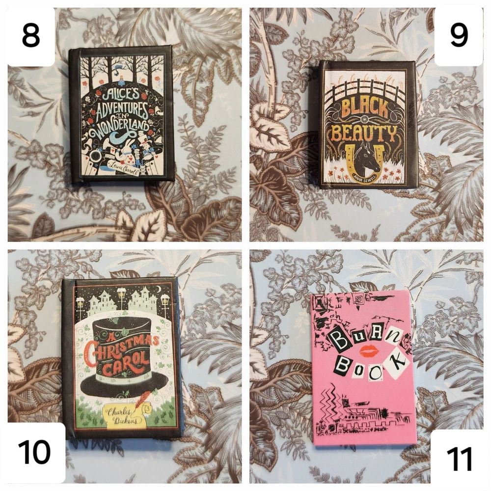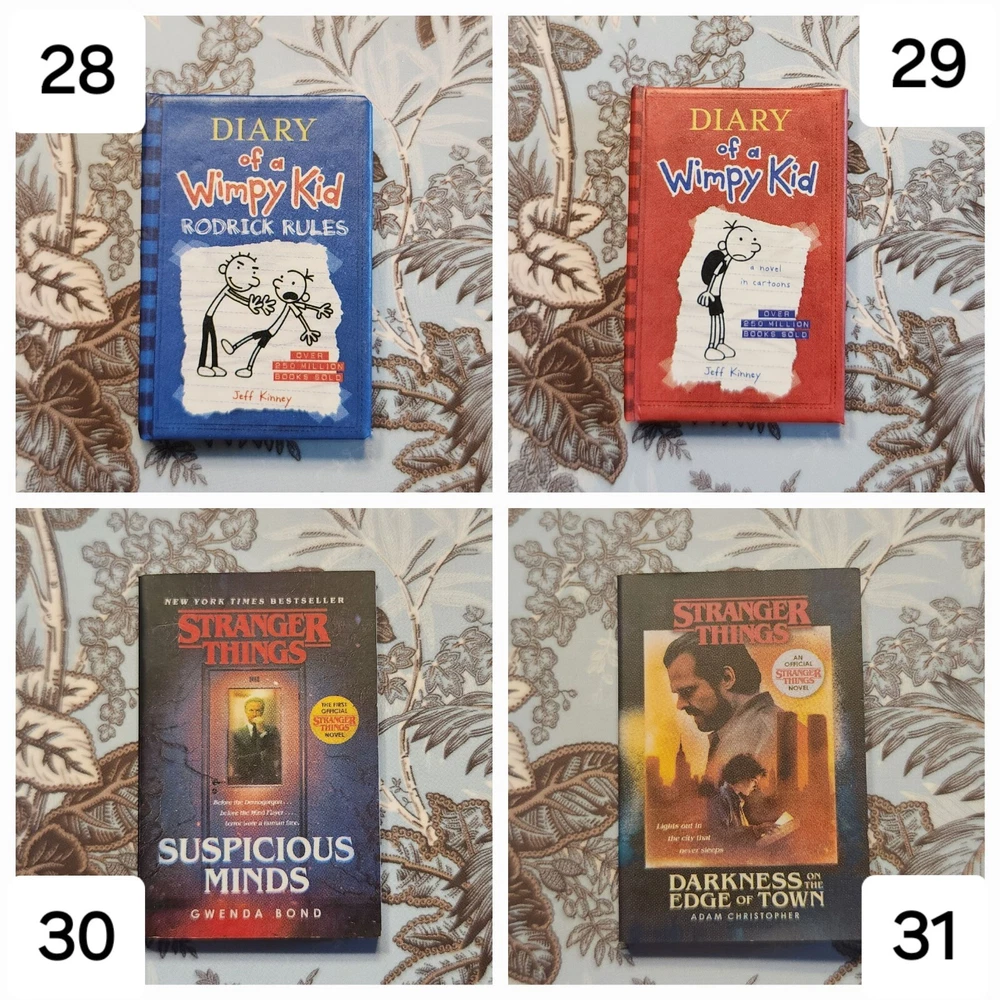 Mini Brand Books List: LEGENDARY: 1: Goosebumps - Night of the Living Dummy (Legendary) ICONIC: 2: Stranger Things - World Turned Upside Down LUXURY: 3: Miss Peregrine's Home for Peculiar Children 4: Dog Man 5: Dog Man Unleashed ULTRA RARE: 6: Diary of a Wimpy Kid - The Last Straw (Hardback) 7: Diary of a Wimpy Kid - Dog Days 8: Alice's Adventure in Wonderland 9: Black Beauty 10: A Christmas Carol RARE: 11: Burn Book (Paperback) 12: Clueless 13: Pride and Prejudice 14: Library of Souls 15: Hallow City 16: Babysitters Club - Little Sister 17: Babysitters Club - Kristys Great Idea 18: Cat Kid - Comic Club 19: Howlday Inn 20: Bunnicula COMMON: 21: It Starts With Us 22: Reminders of Him 23: Mad Libs 24: Charlie and the Chocolate Factory 25: The BFG 26: Matilda 27: The Twits 28: Diary of a Wimpy Kid - Rodrick Rules 29: Diary of a Wimpy Kid 30: Stranger Things - Suspicious Minds 31: Stranger Things - Darkness on the Edge of Town 32: Goosebumps - Haunted Mask 33: Goosebumps - Night of the Living Dummy 34: Goosebumps - Deep Trouble 35: Goosebumps Trio - Get All 3! 36: Vampire Diaries - The Fury 37: Vampire Diaries - The Awakening 38: Mini Magnifying Glass 39: White Bookshelf 40: Purple Bookmark 41: White Bookmark 42: Brown Bookmark 43: Brown/White Bookmark 44: Red Bookmark 45: Blue Bookmark Flat rate shipping of $4.00.