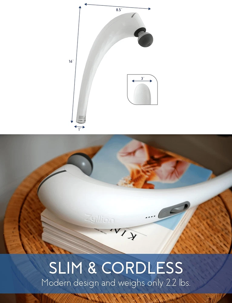 Zyllion Handheld Back and Neck Massager - Cordless Rechargeable Electric Vibrating Deep Tissue Massage with Heat for Athletes, Recovery and Muscle Pain Relief - White (ZMA-27-WT) Product Details Color: White Brand: Zyllion MPN: ZMA-27 UPC: 850001290173 EAN: 0850001290173 Use for: Whole Body Power Source: Battery Powered Material: Silicone Item Weight: 2.2 Pounds Brand: Zyllion Product Dimensions : 8.5 x 1 x 16 inches; 2.2 Pounds Item model number : ZMA-27 Department : unisex-adult Batteries : 1 Lithium Polymer batteries required. (included) Date First Available : November 10, 2020 Manufacturer : Zyllion POWERFUL 5,000 RPM PERCUSSION MOTOR: is the most powerful handheld massager in the market that gets real deep into the muscle tissue to help ease and relax muscle cramps, knots, tensions and strains. This high intensity massager effectively increases blood flow to relieve muscle pain in seconds. ERGONOMIC, CORDLESS AND RECHARGEABLE DESIGN: features a curved shape that allows you to easily reach behind your back and massage hard to reach areas, getting both your upper and lower back. The 2200mah battery capacity last up to 180+ minutes (at full charge). Versatile and powerful enough for any professional athlete and for in-home use, muscle therapy and recovery. INTUITIVE LED INDICATOR AND USER-FRIENDLY SCROLL WHEEL: helps you find the perfect intensity. The led lights changes different colors from blue, green, orange and red (lowest to highest intensity). To turn on, simply scroll up and choose between intensities by scrolling further up or down. No need to press or hold any buttons. SOFT SILICONE HEADS AND BALL ATTACHMENT WITH HEAT: comes with 5 different node attachments specialized for different parts your body. The ball node attachment features a soothing heat function unlike other cordless handheld massagers to help with blood circulation by transferring warmth to the muscles to ease fatigue. LIFETIME CUSTOMER SERVICE SUPPORT: our products are covered by a 1-year warranty (2 years with registration). 100% satisfaction means the world to us and if anything happens to your device within a 1-year period, well send you a replacement at no cost to you. Our mission is to help you unwind and regain balance in your life, which is why we strive to bring the most therapeutic and innovative health and personal care products. Zyllion ZMA-27 Handheld Cordless Rechargeable Percussion Massager From Zyllion, Relaxation Meets Innovation! Unlike other handheld massagers, our advanced and intuitive features include: Powerful 5,000 RPM motor, most powerful in the market.Ergonomic curved shape, easily reach behind your back.Softer silicone head attachments for a more comfortable massage.Ball attachment with heat for better blood flow and circulation.LED intensity indicator to easily switch between low and high intensity levels. 5 Interchangeable Massage Nodes Each massage head is easy to remove and install: Round "Ball" Head - General point massage.1-Point Head - Focused trigger acu- point massage.2-Point "Fork" Head - Double trigger acu-point massage.6-Intensive Head - Large area soft contact massage.Curved Head - Focused arm and leg massage. Rechargeable 2200mAh Battery Capacity Recharges to full in only 2 hours, allowing you to use the massager for up to 180+ minutes. 4 white LED lights = Full, 1 White LED = Low. Ball Attachment with Heat Function The heating function only works if the ball massage head is attached. After turning on the massager, press the heating button to start heating, and press again to stop heating. Versatile, Lightweight & Portable Weighs 2.2 lbs.Used to massage all body parts from back, neck, shoulders, arms, legs, thighs, foot and more.Includes a travel bag to store the handheld massager and attachments and carry everywhere you go. What’s in the Box: 1x ZMA-27 Massager5x Massage Heads1x Travel Bag1x Charging Cord1x User Manual With thousands of satisfied users and counting, thanks a Zyllion!