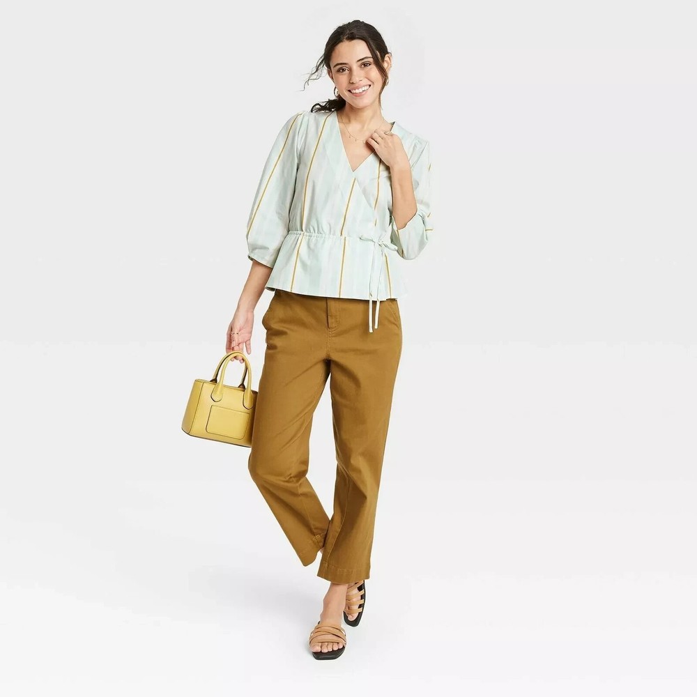 This A New Day women's top features a flattering wrap style with a V-neckline and puff sleeves in a mint green color with striped pattern. The long sleeves and XXL size make it suitable for casual, workwear, or business occasions. Made of a blend of polyester, cotton, and rayon, this lightweight and breathable top is machine washable and perfect for all seasons, especially summer and spring. The strap accents add a stylish touch to this classic and basic T-shirt design.