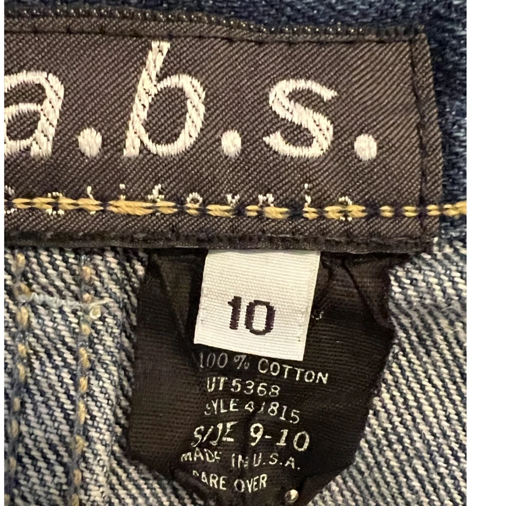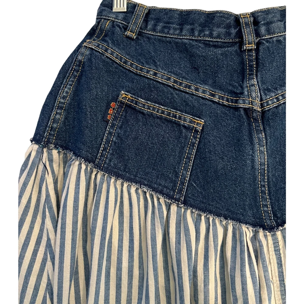 Vintage, please confirm measurements 26" waist 35" waist to hem 7" rise excellent condition, no flaws a.b.s. vintage denim skirt ** features a striped pattern of blue & white with solid denim at waist to hips ** bohemian style and full silhouette ** high-quality cotton denim, ** pockets ** zip front with button close, belt loops ** machine washable ** made in the United States ** all items stored in a smoke-free & pet free home