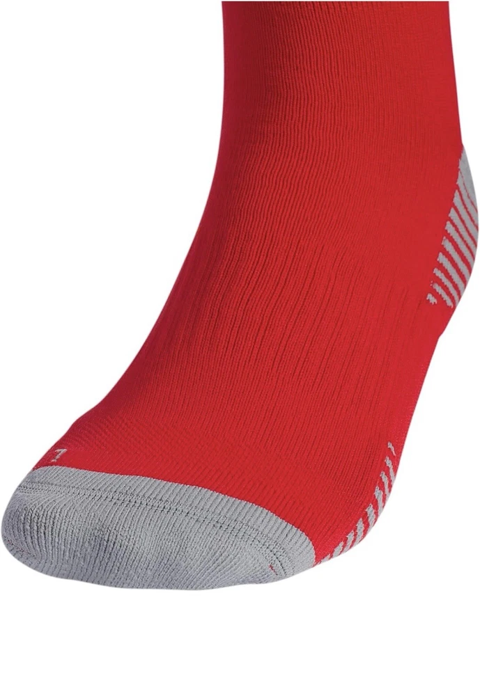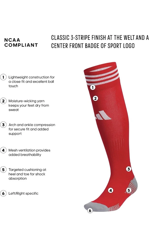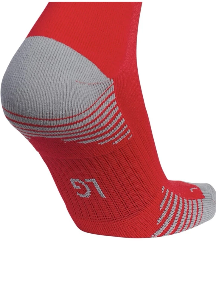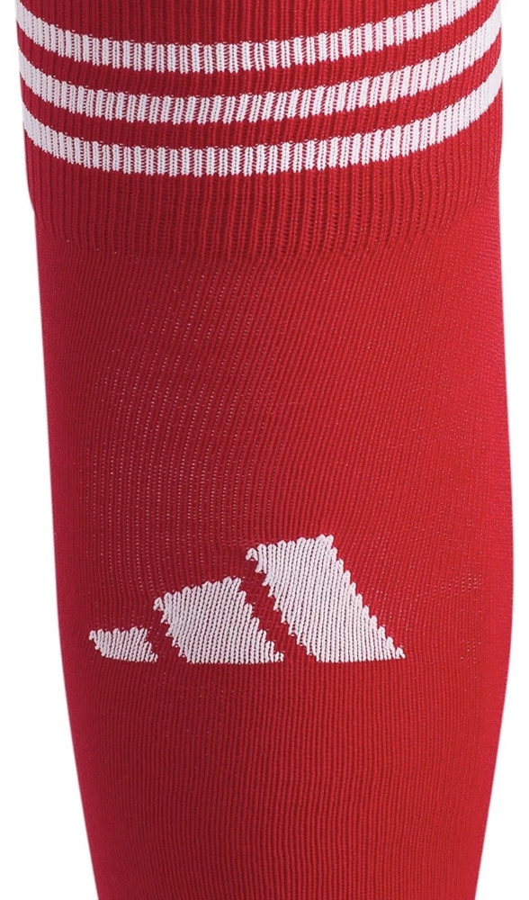 About this item • Moisture-wicking yarn keeps your feet dry from sweat • Classic 3-Stripe finish at the welt and a center front Badge of Sport logo • Targeted cushioning at heel and toe for shock absorption • Arch and ankle compression for secure fit and added support • Lightweight construction for a close fit and excellent ball touch • Mesh ventilation provides added breathability Description Before you head out on the pitch, pull on these adidas soccer socks. The 3-Stripes are the last thing the competition will see just before you score. Airy mesh in key areas, moisture-wicking yarn and the over-the-calf length keep you ready for action.