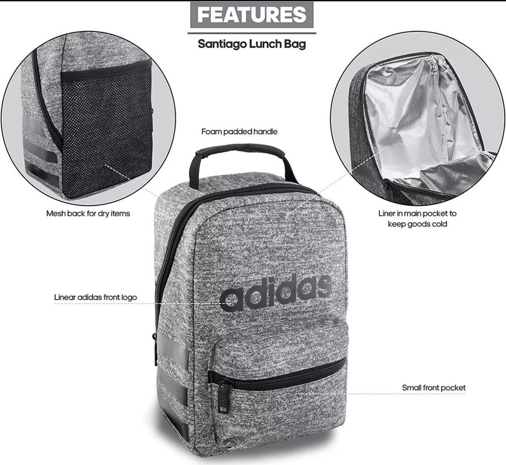 Department:Boys, Girls, Kids, TeensNumber of Slots:1Size:MediumItem Length:7 inType:Lunch BagModel:adidas Santiago IIStyle:LogoShape:RectangularFeatures:InsulatedCountry/Region of Manufacture:IndonesiaPattern:HeatherUPC:888254114076Lid Type:HandleItem Height:11 inBrand:adidasMaterial:100% PolyesterItem Width:4.5 inNumber of Items in Set:1Color:Jersey Onix Grey/blackgtin13:888254114076Number in Pack:1Personalize:NoNumber of Compartments:2