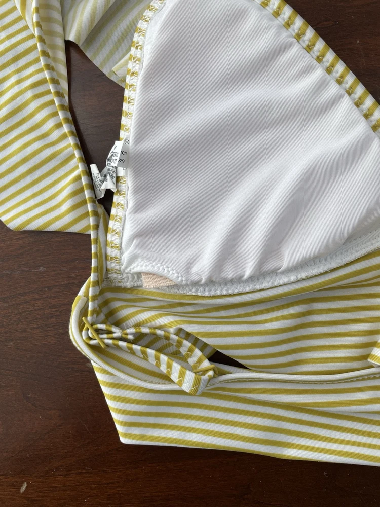 aerie Women's Striped Ruffle Adjustable Strap Padded Triangle Bikini Top Yellow S. Condition is pre-owned. Smoke free, pet free home. Shipped via USPS Ground Advantage. In very good condition. Free of rips or stains.