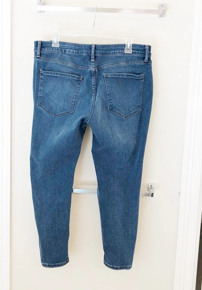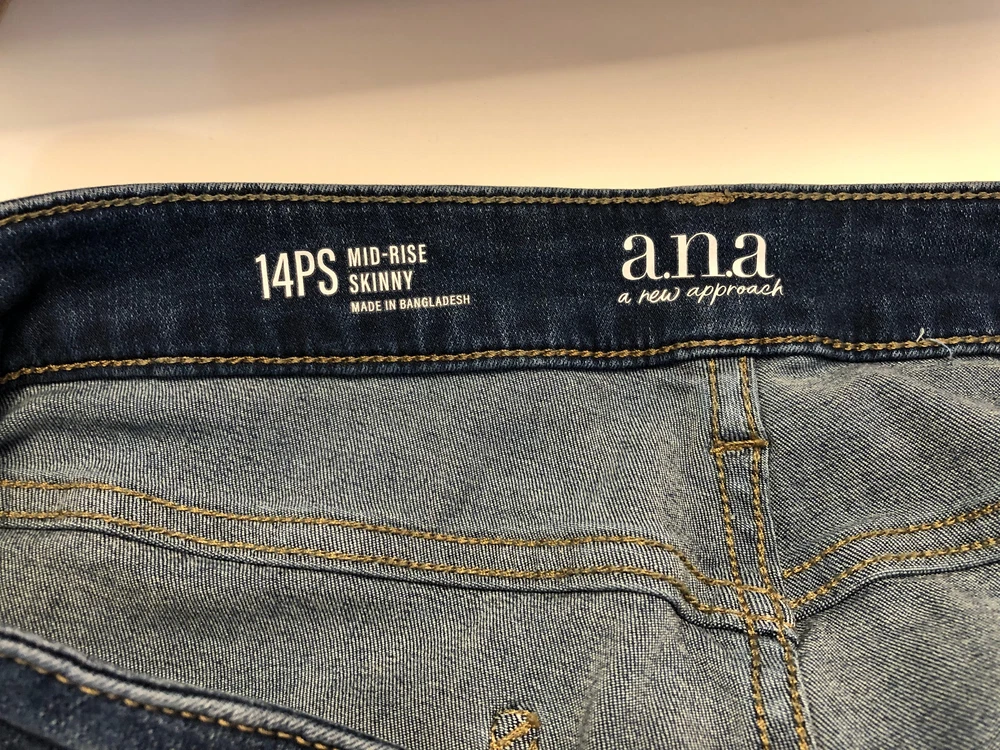a.n.a mid-rise skinny jeans, size i4PS Standard 5-pocket styling with button'zip and belt loops Inseam about 25" Waist 18" flying flat (remember, this is mid-rise) Rise about 13" 65% cotton, 21% rayon, 13% polyester, 1% spandex - smooth denim fabric with a bit of stretch Worn/washed a few times, still in great condition