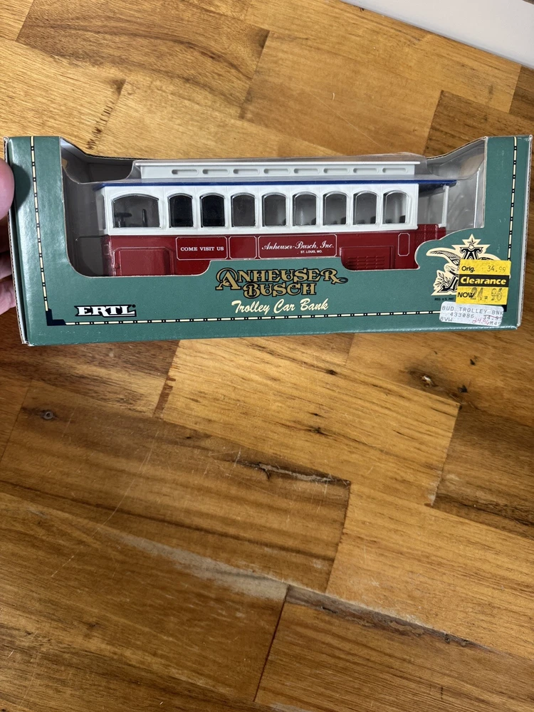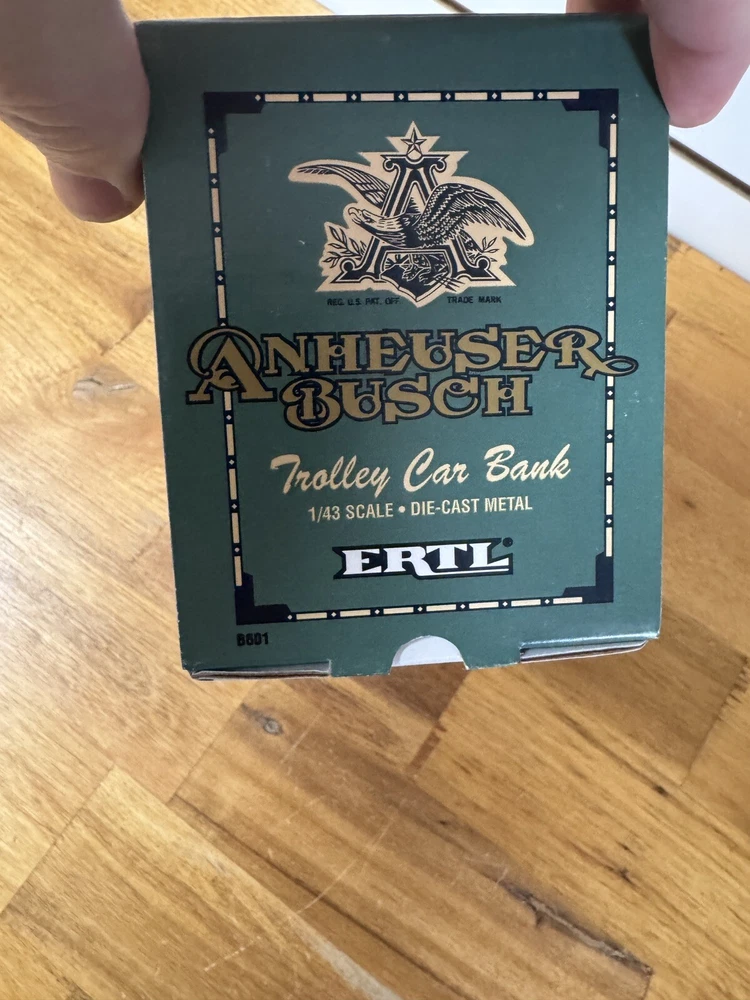This diecast toy vehicle bank is a great addition to any collection. The Anheuser Busch Trolly Car Bank by Ertl is a 1:43 scale replica of the iconic vehicle. It is made of durable metal and is in excellent condition. This item is perfect for collectors of contemporary manufactured diecast vehicles and will make a great addition to any collection.