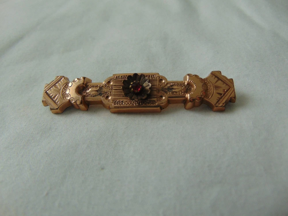 measures 2-1/3 inches across. very ornate Etruscan Revival design and style. genuine Garnet mounted in center of brooch. very collectible.