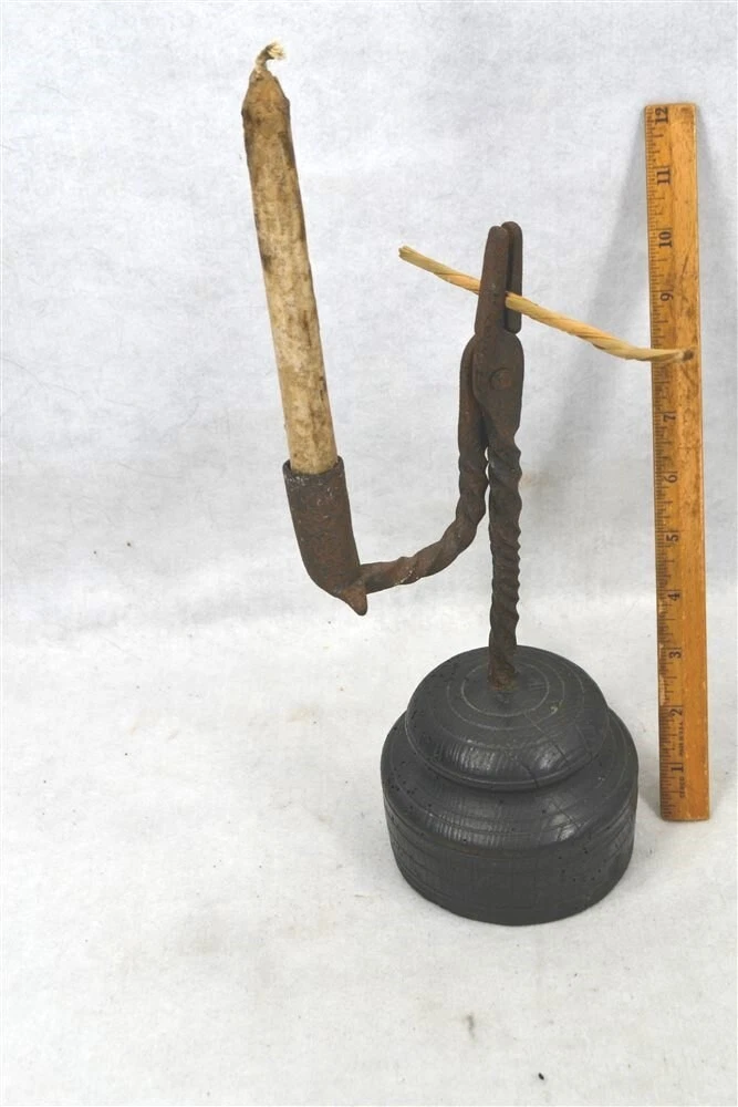 antique rush/candle lamp holder forged 11.5 in. w/candle & rush 18th c original antique table top rush/candle lamp with candle and rush 1. original not reproduction, late 1600s to 1700s 2. all in very good condition 3. nothing broken 4. some slight play in the rush clamp, works well holds rush, just a little play 5. candle is old, not sure if it is tallow 6. rush is old 7. I have not cleaned this, some light surface rust on metal, will brush off 8. bottom wood is hand turned, solid and sits well 9. very nice all original lamp approximate measurements 1. total height 11.5 in. 2. base 4.45 across the bottom x 3.5 high 3. candle holder 1.75 x 5/8 in. opening 4. candle 5.75 long priority or ground advantage shipping and handling in US scroll down for larger photos You may be interested in our other eBay listings . I send a note at the end of the sale with payment information. Payment is expected within 2 days. We ship promptly within 1 day on receipt of payment. All US packages have tracking and are insured. International Buyers We ship international with United States Postal Services. USPS First Class postage and Flat Rate Priority Boxes or Envelopes can now be tracked to some countries . International packages over $100 ship priority or express. Contact us for more information. Import duties, taxes and charges are not included in the item price or shipping charges. These charges are the buyer’s responsibility. Please check with your country’s customs office to determine what these additional costs will be prior to bidding/buying.” . Powered by SixBit's eCommerce Solution