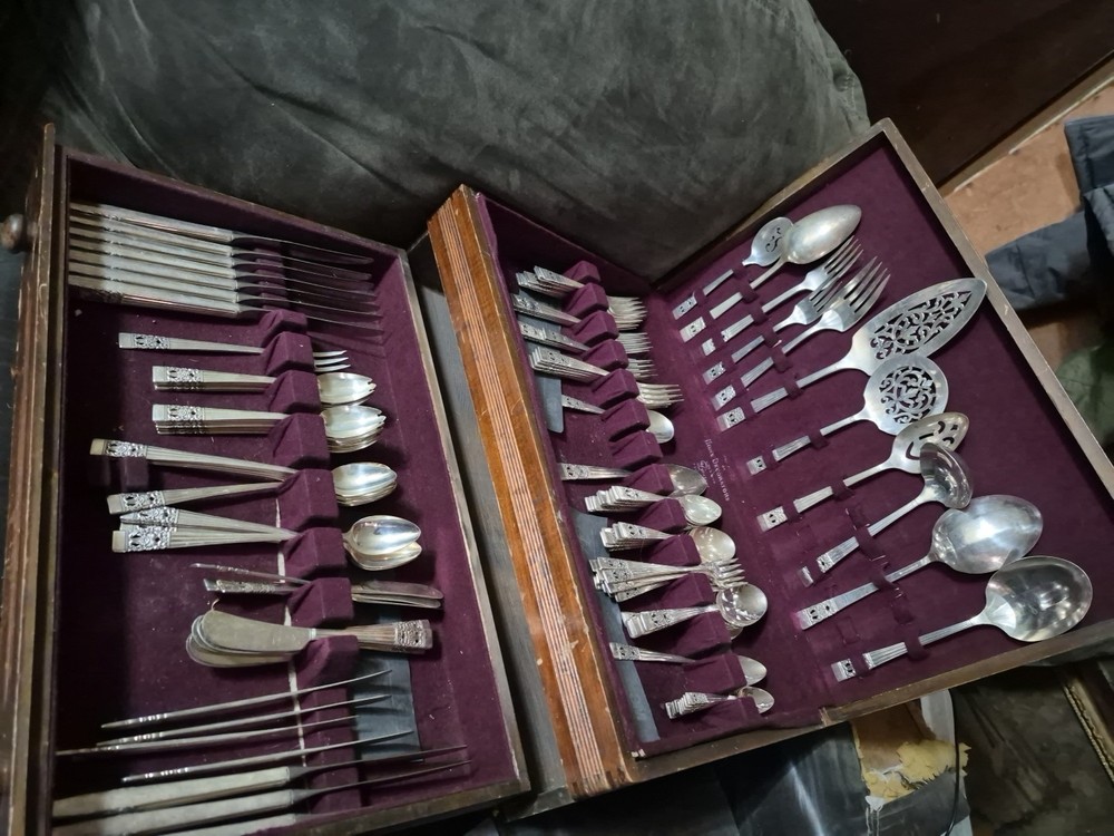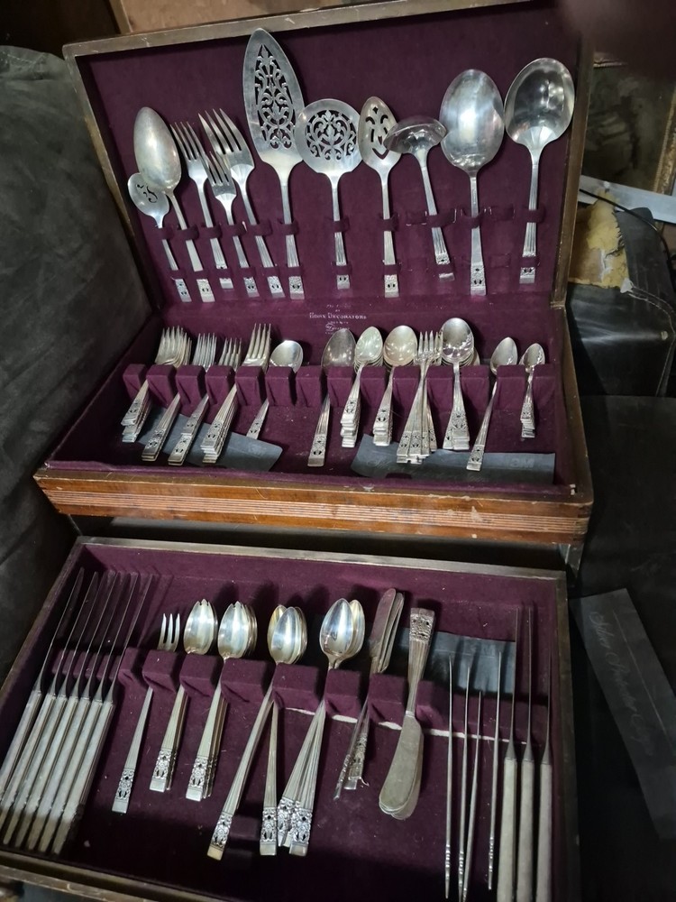 The antique silverware set by ONEIDA is a stunning collection of Coronation pattern flatware made of silverplate. Dating back to between 1900-1940, this set exudes a timeless elegance and sophistication. Perfect for adding a touch of vintage charm to any dining table, this set is a true testament to the craftsmanship and quality of bygone eras.