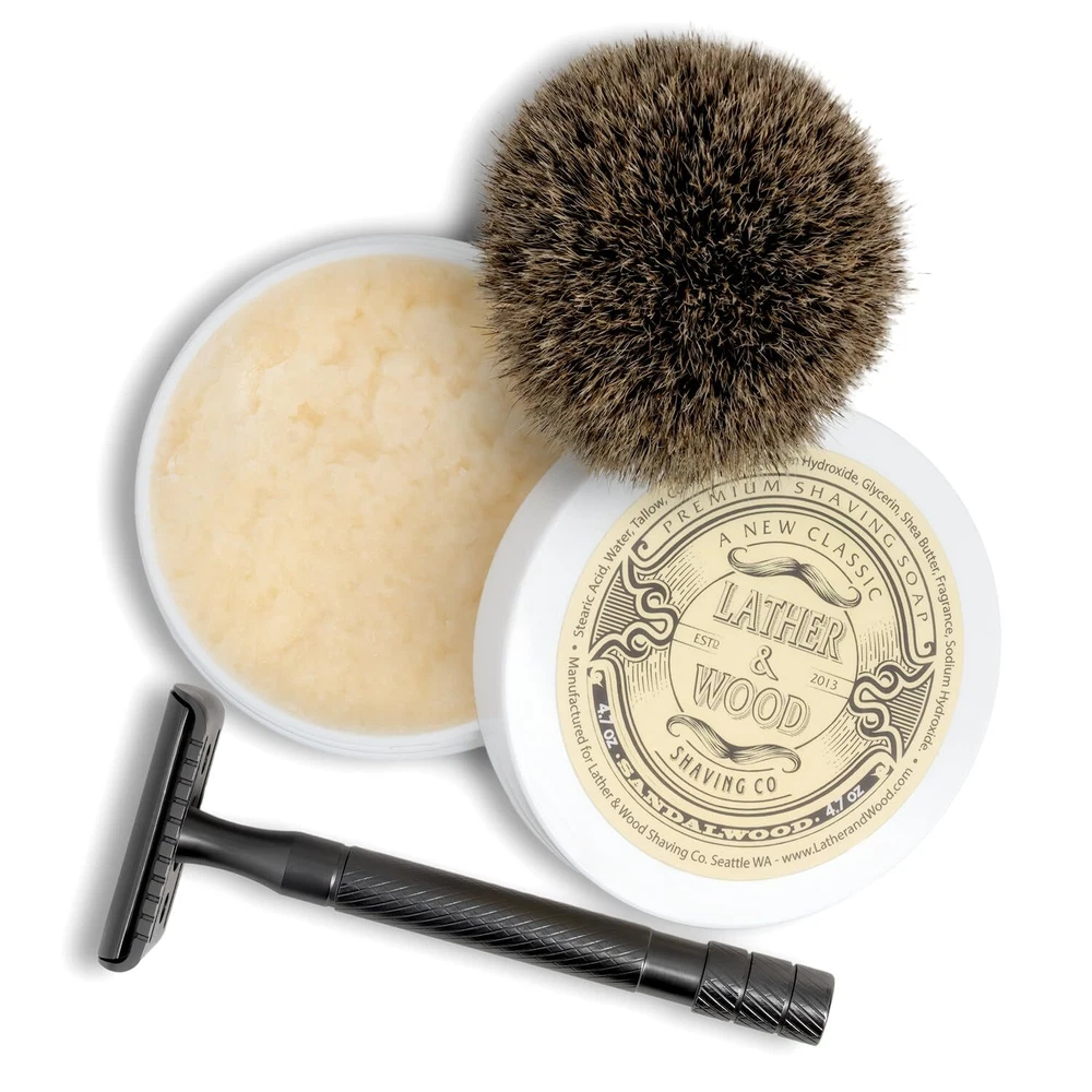 Lather & Wood Shaving Soap gives up one of the richest, high quality, full bodied lathers you'll ever experience. Our Premium shaving soap is something that really does have to be experienced to believe as words don't do justice. It starts with a warm shaving brush. After soaking a pure badger brush in warm water, Just load a little soap into the tips of the brush. This is where the magic starts. Swirl the brush around in your shaving bowl until a warm dense, rich lather fills the bowl.....It should only takes a few swirls for the lather to start. But the Best Part is Yet to come. While applying the lather to your face you will enjoy the delicate yet masculine scent.......think classic barbershop. A scent that's not too strong but will linger subtly for hours after you shave. The perfect wet shave experience doesn't stop there. Once applied your senses will be amazed how your razor glides without effort or friction across your face. You might find yourself asking "How can a shaving soap make shaving feel this good!" Believe me, a great shaving soap DOES make a difference LARGE 4.7oz SHAVE SOAP. A premium tallow based shaving soap for literally pennies a day. Get MONTH-after-MONTH of daily wet shaving satisfaction. Perfect with your favorite shaving brush and safety razor, multi-blade, or straight razor for the more daring type. HAND CRAFTED IN SMALL BATCHES To Insure Highest Quality Possible. As wet shaving enthusiasts we have used all the major and micro brand soaps, and this soap is nothing short of perfection. SOPHISTICATED SANDALWOOD SCENT - This Sandalwood Shaving Soap has a wonderful earthy natural sandalwood scent. Not too strong, but subtlety lingers long after your shave. Pairs Perfectly with Lather & Wood’s Sandalwood Pre-Shave Oil and Sandalwood Aftershave Balm. TOSS THAT DRUGSTORE SHAVING CREAM IN THE TRASH - . produces only the finest quality shaving and mens grooming products. Our shaving soap will leaves your skin feeling cool, refreshed, and clean. You'll never touch the commercial stuff again! CUSHY TALLOW BASED SHAVING SOAP Ingredients like Tallow and Shea Butter produces a ridiculous amount of dense slippery lather. Our lather does not dissipate even after an hour of sitting in your shaving bowl. Amazing Lather, Moisturizing, Slip, and Protection