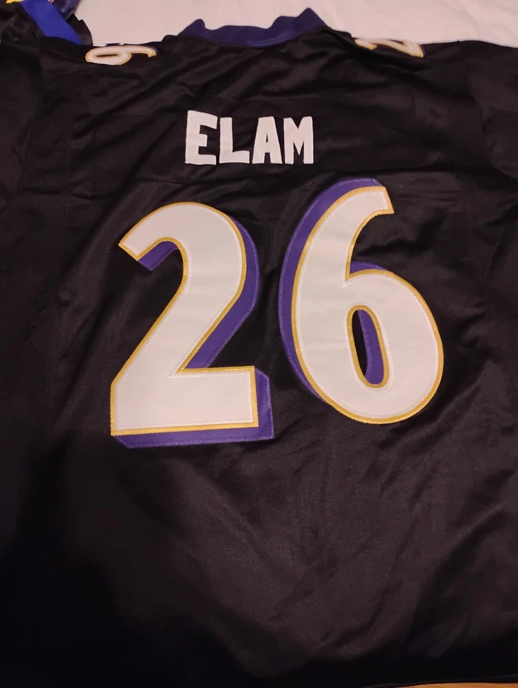 Show your love for the Baltimore Ravens with this Super Bowl jersey featuring player Elam's name on the back. This jersey is perfect for any fan of the National Football League (NFL) and is a must-have for those who attended the Super Bowl. The size is a medium and the product is a jersey. The jersey is made for fans of the Baltimore Ravens and features their team name prominently. It is a great way to show your support for your favorite team and is perfect for wearing to games or just out and about. Get this jersey now and show your love for the Baltimore Ravens!