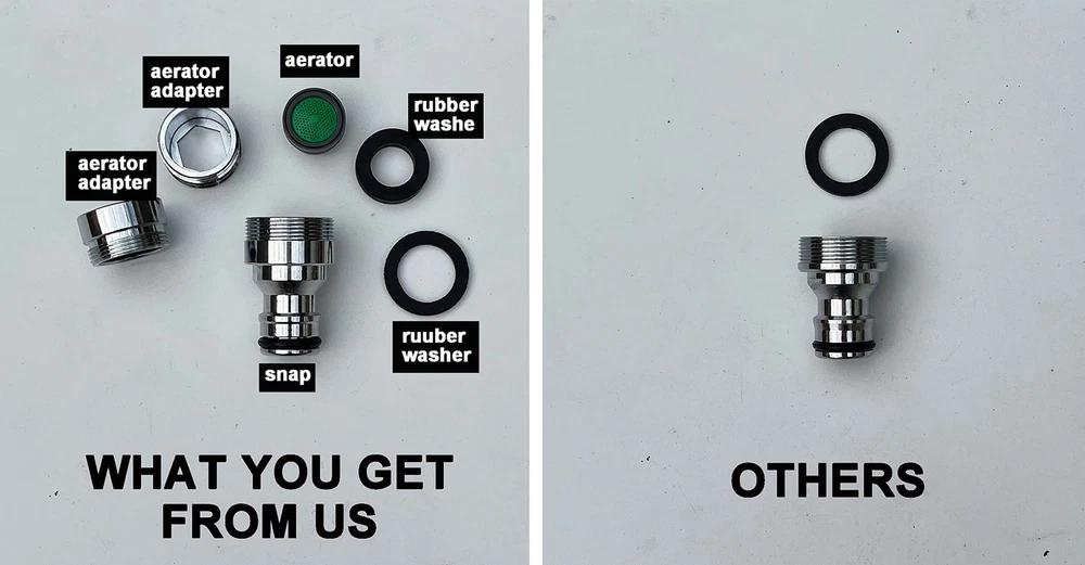 Installation Ⅰ.Unscrew the original aerator from your faucet. Ⅱ.For 55/64 male or 15/16 female threaded faucet, you just simple screw the snap on/in. For other threads Ⅲ. For 13/16 male or 55/64 female, you will need to an aerator adapter to connect faucet and the snap. Ⅳ.Connect garden hose or other hoses with 3/4 GHT female end to the quick-click coupler Ⅴ. Pull down on the outer sleeve and snap onto the sink. Ⅵ. After use, detached the hose; Without any screwing on and off, the snap remains attached to the sink for daily use 【ALL BRASS】 This quick attach kit includes a chromed snap and a brass quick-clip attachment part. they are both brass construed and last a lot longer than the plastic parts, the frequent stretching of a plastic snap will eventually cause the clip to fail. 【4 TYPES OF THREADING, ADAPTING A WIDE RANGE OF INDOOR FAUCETS】The nozzle that attaches to the faucet has both female/internal and male/external threads, It even comes with another 2 aerator adapters. Adapting to standard indoor kitchen sink, lavatory sink, utility sink and bathroom sink faucets. IPS: But you may be still having fitting problems, us for advises 【FAUCET ADAPTER TO 3/4" FEMALE GARDEN HOSE】allows quickly connect the garden hose with 3/4 in. GHT female end ( 5/8 inch diameter) to a indoor faucet,. Works perfect for portable washer/washing machine, patio watering , filling aquariums, putting warm water in pool outside, bathing pet .etc. 【QUICK CONNECT & RELEASE】This quick connect adapter kit is well designed and easily snaps on/off. It is a great adapter to have especially you are constantly hooking up a extend garden hose to an indoor faucet, you just quick release it after use, leave the chromed snap on faucet instead of unscrewing it every single time 【BUILD IN AERATOR,ANTI-SPLASH】the snap adapter that remains on faucet incorporates a removable build-in aerator which keeps water stream running smooth and no splashing all around, when disconnected after use, you still get a 'normal' stream of aerated water for daily use instead of switching it back and forth