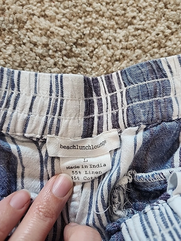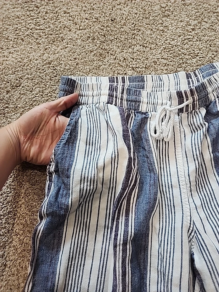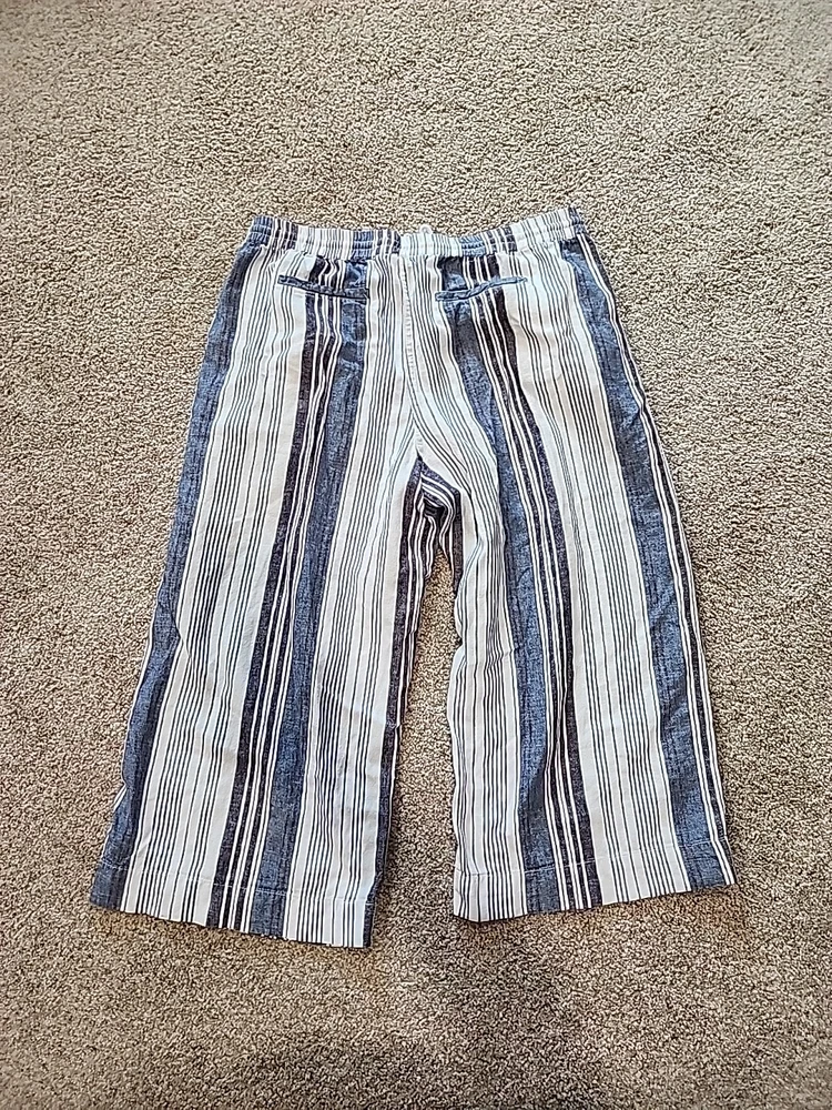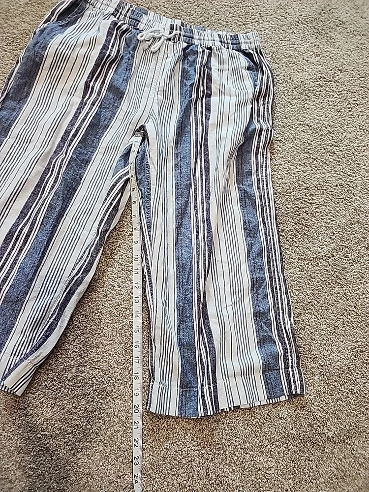 Pants in excellent condition with no rips or stains. Measurements on photos. These Beach Lunch Lounge capri pants are designed in a blue, white, and purple striped pattern, perfect for a casual or travel outfit. Made of a linen blend material, they feature an elastic waist for easy pull-on wear and have a wide-leg silhouette with a 20-inch inseam. The pants also include convenient pockets for added functionality, making them a comfortable and stylish option for beach or bohemian-themed looks.