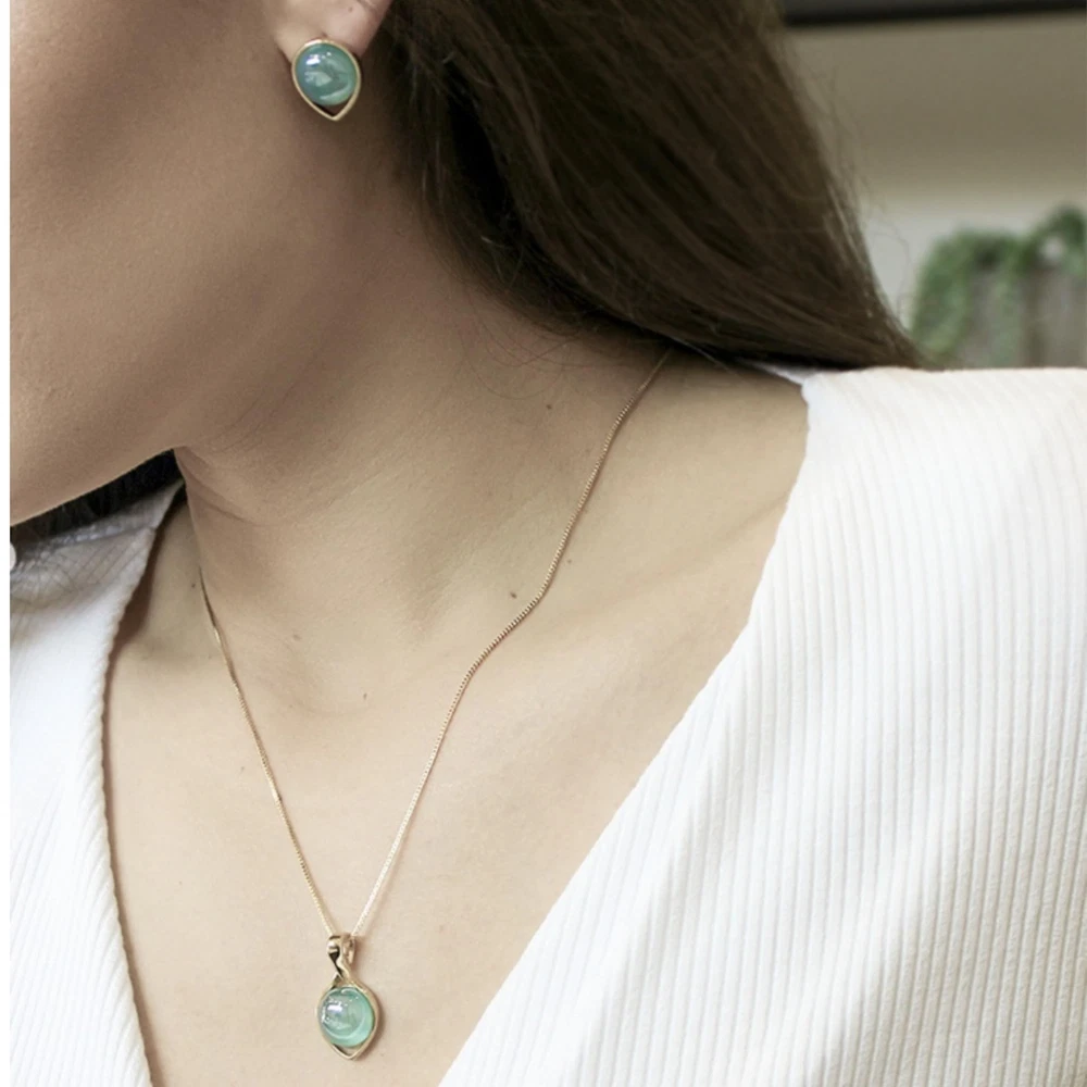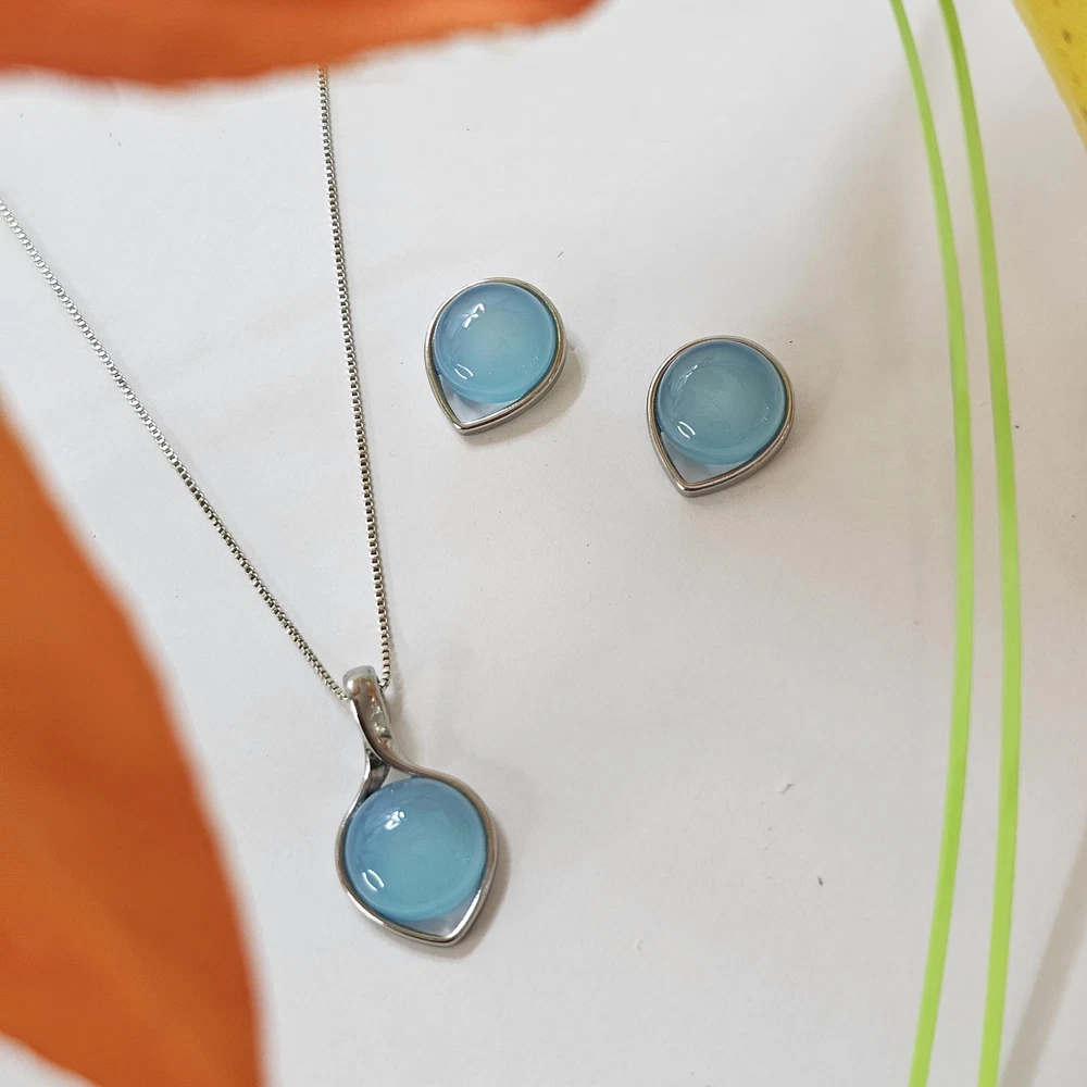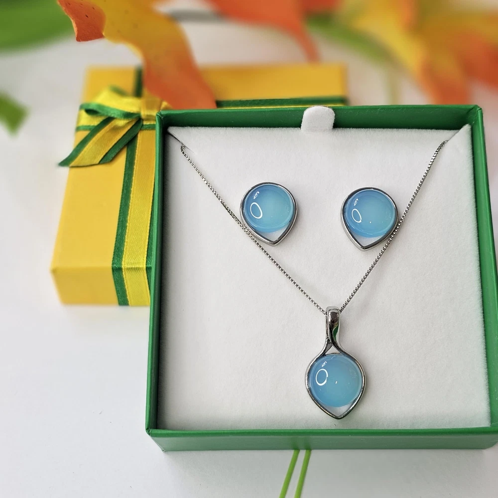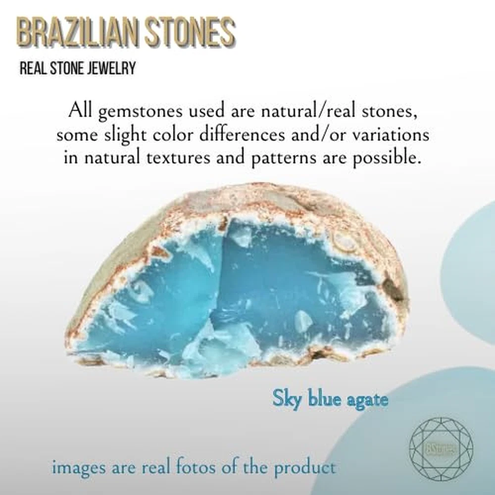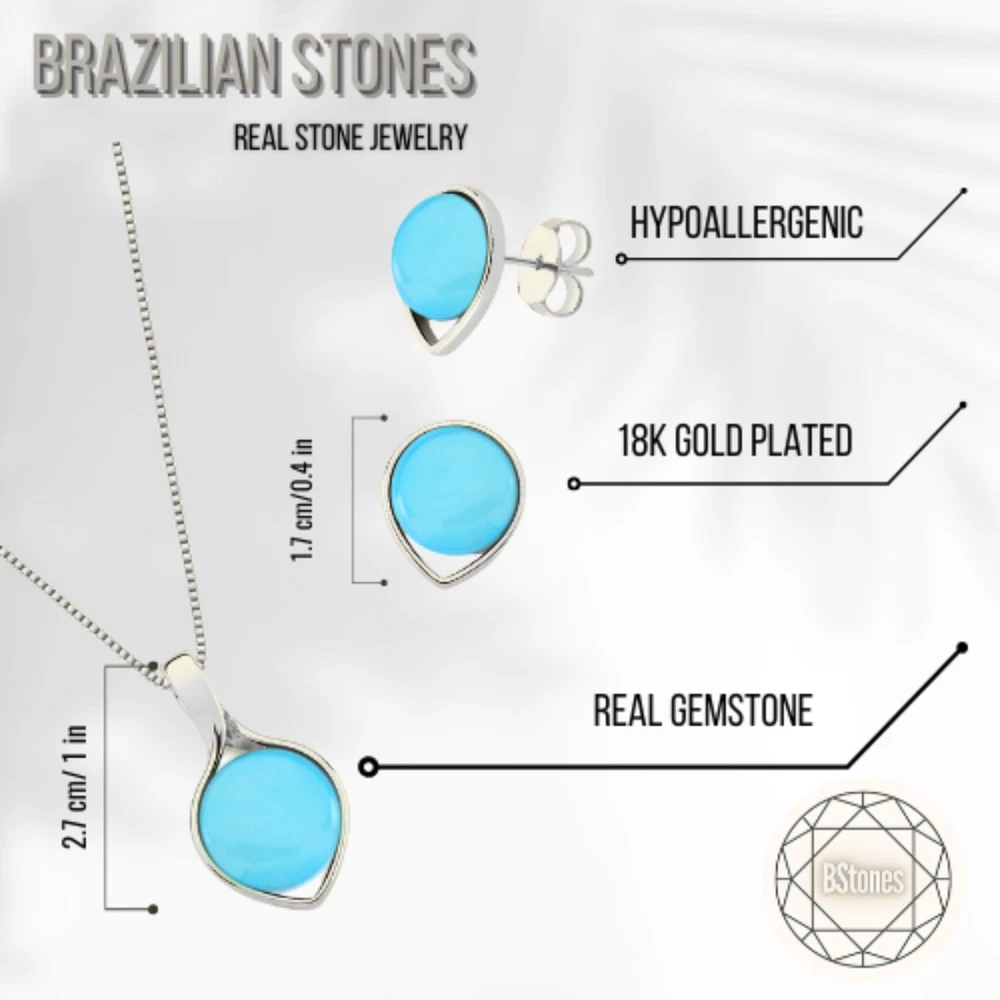 blue, black or green Stud Earrings and Brazilian Necklace of Natural Agate Stones - Brazilian Designed 18k Gold Plated Earrings and Necklace for Fashion Lovers - Comfy Hypoallergenic Statement Jewelry set for Women 3/4 inch (1,8 cm) Product Details Color: Blue Agate White Gold Brand: BStones MPN: R320207AA UPC: Does not apply EAN: Does not apply Package Dimensions : 3.15 x 3.15 x 1.18 inches; 1.69 ounces Department : womens Date First Available : June 5, 2024 Brand, Seller, or Collection Name: BStones Metal: white gold plated Material: Stone Gem Type: Blue Agate Clasp: Push Back Clasp Minimum color: Blue Number of stones: 3 Stone Creation Method: Natural Stone Treatment Method: no treatment Introducing our exquisite Gemstone Jewelry Set for Women by BStones. Design with precision and style, this set is designed to look captivating and compliment your beauty. From stunning earrings to a dazzling necklace, each piece displays sophistication and grace.Improve your ensemble with our gold necklace for women, made to add a touch of glamour to any outfit. Adorned with sparkling gemstones, this women necklace is a statement piece that will turn heads wherever you go. Whether worn alone or layered with other pieces, it's sure to make a lasting impression.Complete your look with our exquisite gold- plated earrings, designed to complement the necklace perfectly. From delicate studs to elegant pendants, our earrings for women offer versatility and style. Made with hypoallergenic materials, they're suitable for even the most sensitive ears, ensuring comfort all day long.Our jewelry sets for women are the perfect choice for any occasion. Whether it's a special anniversary or a casual outing with friends, this unique crystal jewelry is sure to make you feel special and confident. With its timeless design and impeccable craftsmanship, it's a gift that will be adored for years to come.At BStones, we take pride in creating high-quality jewelry that exceeds expectations. Each piece in this set is inspected to ensure it meets our rigorous standards of excellence. From the shimmering crystals earring to the durable gold plating, every detail is carefully added to perfection.Express your unique style with our gold necklace stack, featuring multiple layers of elegance and charm. Whether you prefer a bold statement or a subtle accent, this set offers endless possibilities for expressing yourself. Stand out from the crowd with our stunning jewelry set for women by BStones.