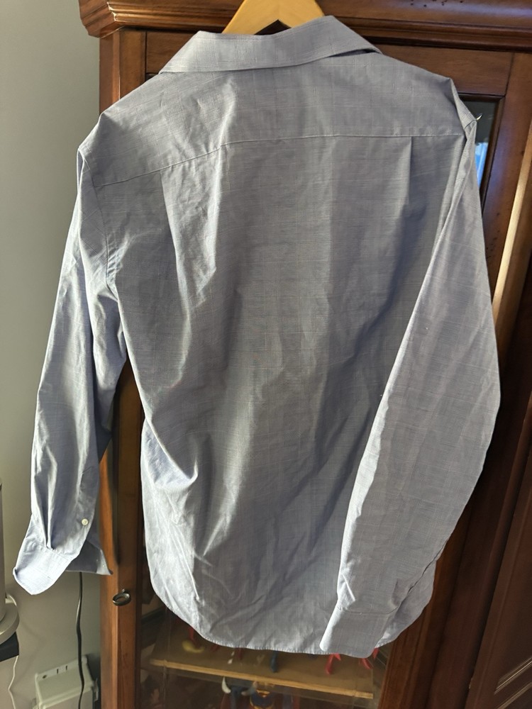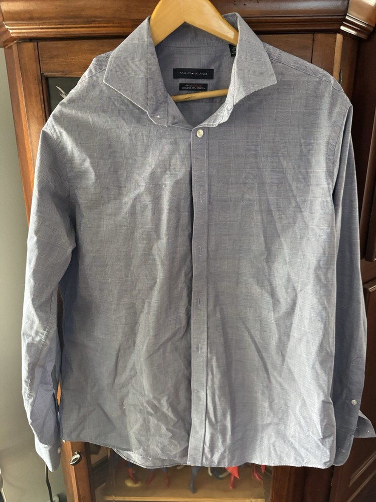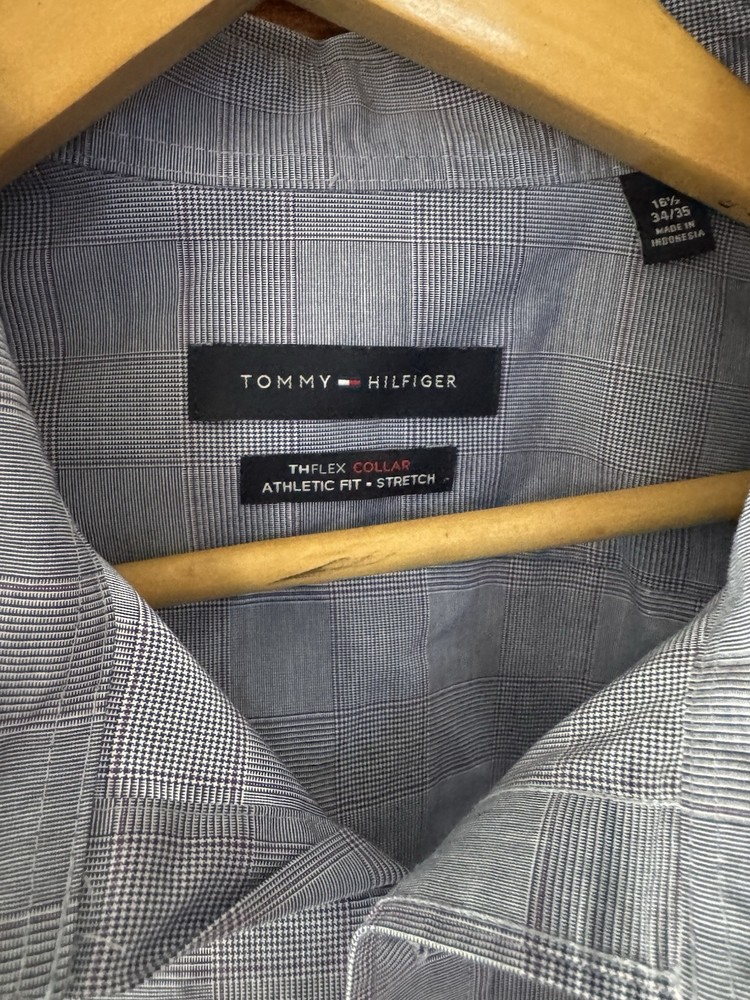This is a Tommy Hilfiger dress shirt for men in a classic blue color. It is a size 16.5 with a regular fit, suitable for everyday wear or more formal occasions. The shirt features a standard 34/35 sleeve length, making it a versatile wardrobe staple for any man looking for a stylish and comfortable clothing option.