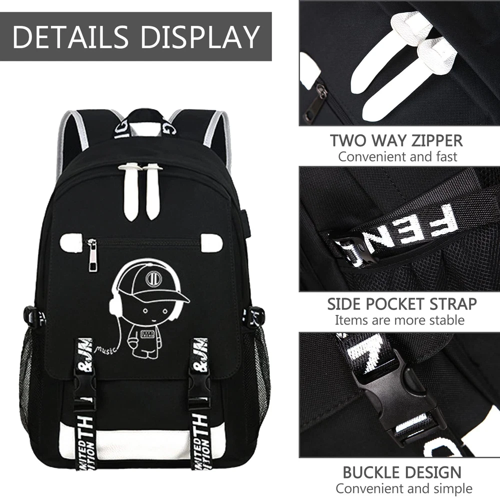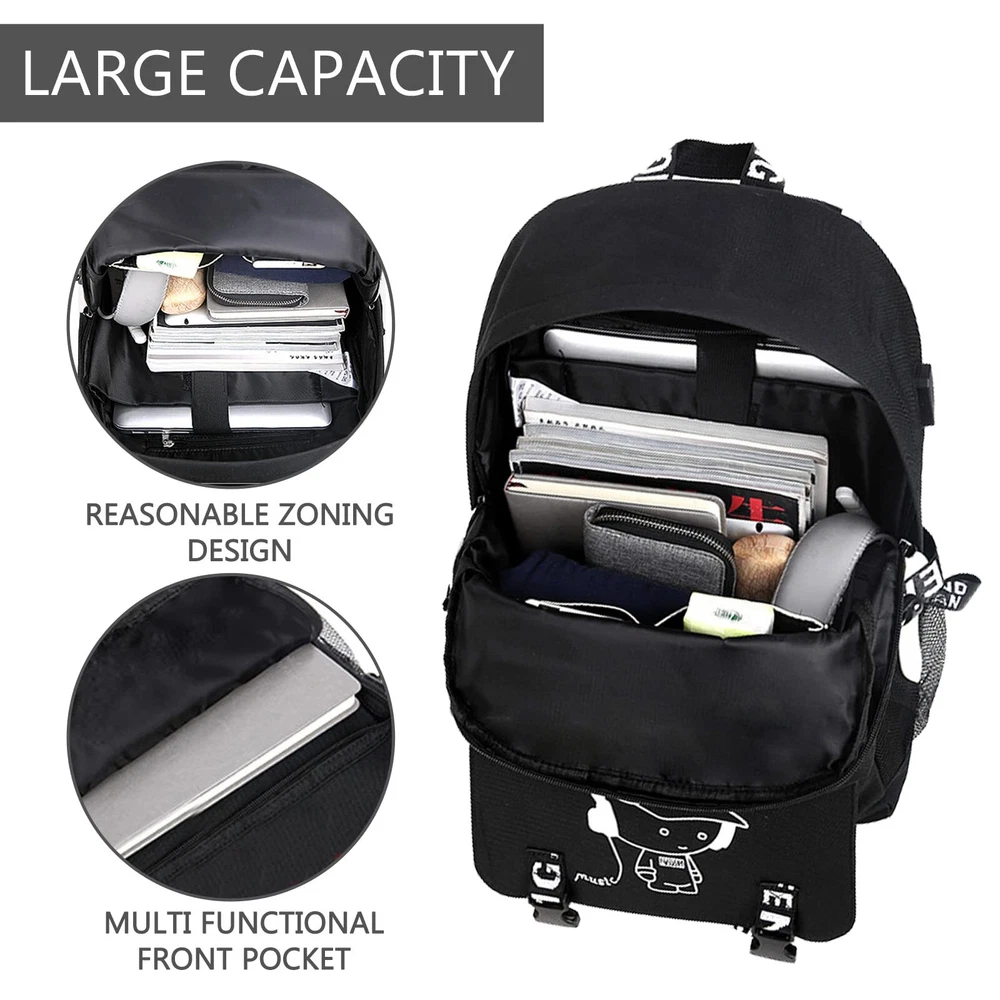Description " We always pay attention to your use experience, and designed this simple and exquisite laptop backpack to help you store your items, and at the same time bring you a comfortable use experience. Product Name: travel on anti theft backpack Material: waterproof Oxford cloth Color: Black Size: 31*17*48cm Style: fashion, casual, simple Product selling point: 1. There are two compartments inside the large backpack, which can easily store computers and daily items, so that your items are organized and no longer messy. 2. The creative pattern design makes full of personality and more beautiful, making you more unique among the crowd. 3. The shoulder straps and bottom of the computer backpack are reinforced, so you don't have to worry about the backpack breaking during use. 4. The anti theft backpack is very suitable for work, travel, camping, making your travel easier. " MADE OF WATERPROOF OXFORD FABRIC:boy backpack.The travel bag is made of high-density Oxford cloth material,school backpack. which makes the laptop backpack excellent waterproof and wear-resistant, and has a longer service life. The smooth two-way zipper design makes the backpack more beautiful and makes your use more convenient. LARGE-CAPACITY STORAGE SPACE:anti theft backpackThere are multiple compartments inside the luminous backpack for , which can classify and store various items. You can even store a 16-inch laptop in the hiking backpack. anti theft backpack.combination lock to make your use more secure and at ease. USB CHARGING&NIGHT LIGHT FUNCTION:The side of the cute backpack has a USB charging port and a headphone jack,middle school backpack which can be easily charged while walking, completely freeing your hands. The creative cartoon music character design can emit light at night,school backpack boys which makes the travel backpack for full of high-end and more unique. IDE RANGE OF APPLICATION OCCASIONS:anime backpack.The large-capacity design of the mesh backpack has multiple compartments inside, which can store a , making your items more tidy. The laptop backpack for can be widely used in , cool backpack.outing, hiking, camping, party, going to work and other occasions, showing your unique life taste. OUR SERVICE GURANTEE FOR YOU:Everything I do is based on customer satisfaction. If you are not completely satisfied with the purchased product or the product is damaged or broken in transit, please contact us in time. We will solve your problem as quickly as possible!