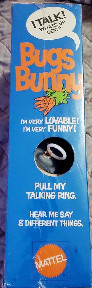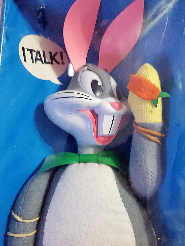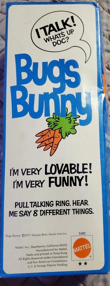 This vintage 1971 Bugs Bunny talking doll is a must-have for any collector or fan of the iconic cartoon character. Made by Mattel and still in its original box, this 11-inch plush toy features a pull string and interactive sounds that bring the beloved Warner Bros. Animation character to life. With its gray color and classic design, this Bugs Bunny doll is perfect for display or play. Its franchise and TV show connections make it a valuable addition to any collection. The doll is made of high-quality material and was manufactured in Hong Kong. Get your hands on this rare and unique item today! New in package Please note perforation in factoy cellophane on front upper left corner Still talks clearly