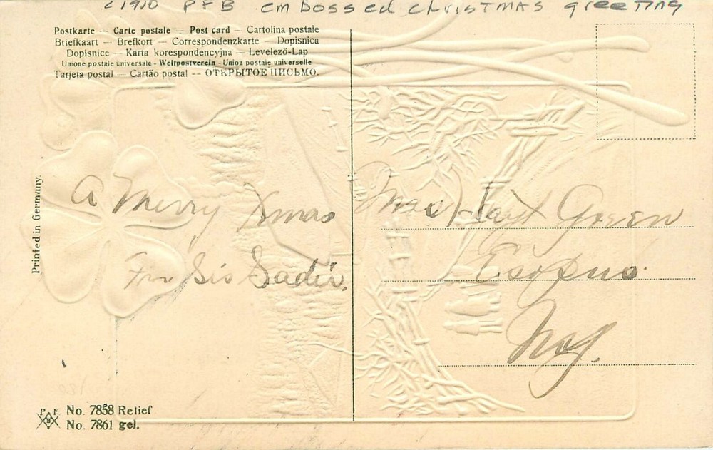 c1910 PFB embossed Christmas greeting people Postcard 25-3079