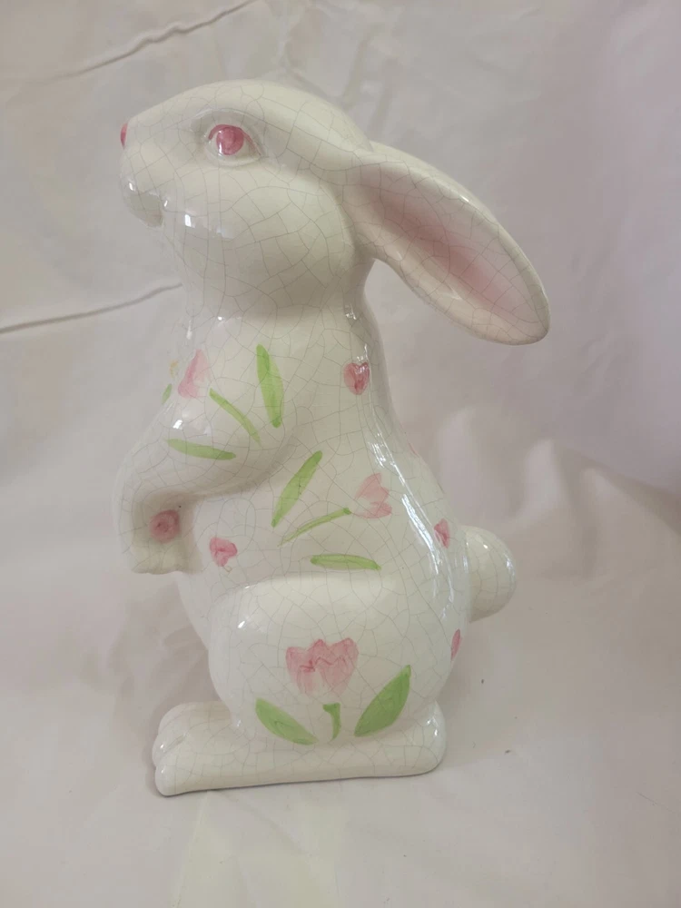 This charming ceramic rabbit figurine is a must-have for any collector or lover of farm and countryside decor. It stands 9 3/4 inches tall. Crafted with exquisite attention to detail, this figurine captures the essence of the beloved animal class, rabbits. Whether you're a fan of cute and cuddly stuffed animals or simply appreciate the beauty of nature, this figurine is sure to delight. Featuring a cute and playful design, this rabbit figurine is perfect for adding a touch of whimsy to any space. Made from high-quality materials, this collectible is built to last and will be a cherished addition to your collection for years to come. So why wait? Bring home this adorable ceramic rabbit figurine today and bring a little bit of the countryside into your home.