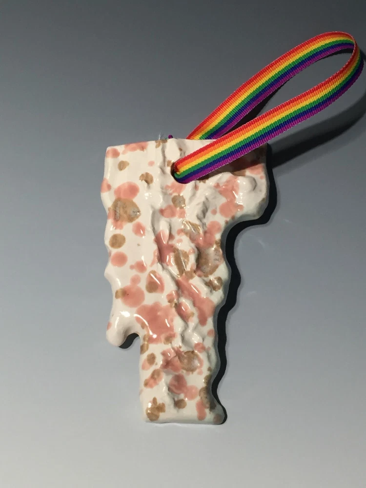 Handmade pottery piece fired to cone 6 with food safe glazes in painterly fashion. This piece was made by me, Curtis Fontaine, an apprentice of Toshiko Takaezu for two years. Most of my work is inspired by time with Toshiko and her spirit towards being an artist. At www.CurtisFontaine.com one can see more of my work. This piece is part of a series of my first cone 6 venture. With lots of experience making these glazes I am finally able to create and combine for new finishes. Unsigned. But can come with signed hand-painted card on request. This multicolor Vermont state ornament is 4.5 in. tall.