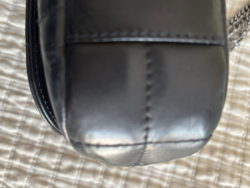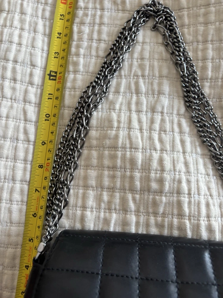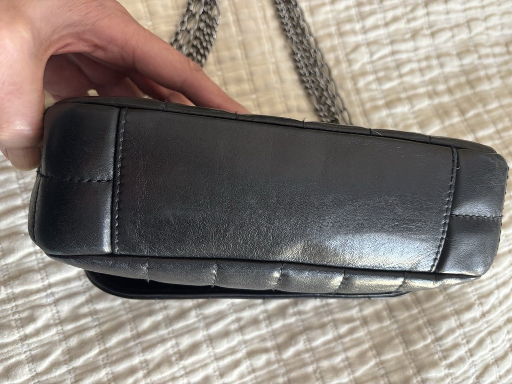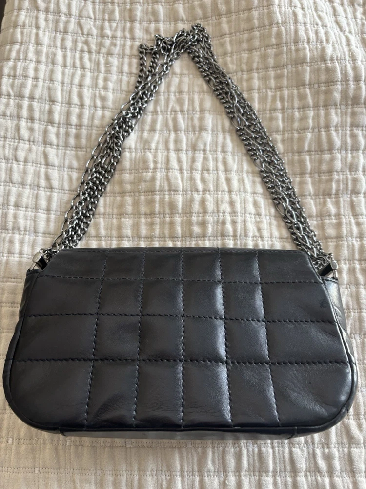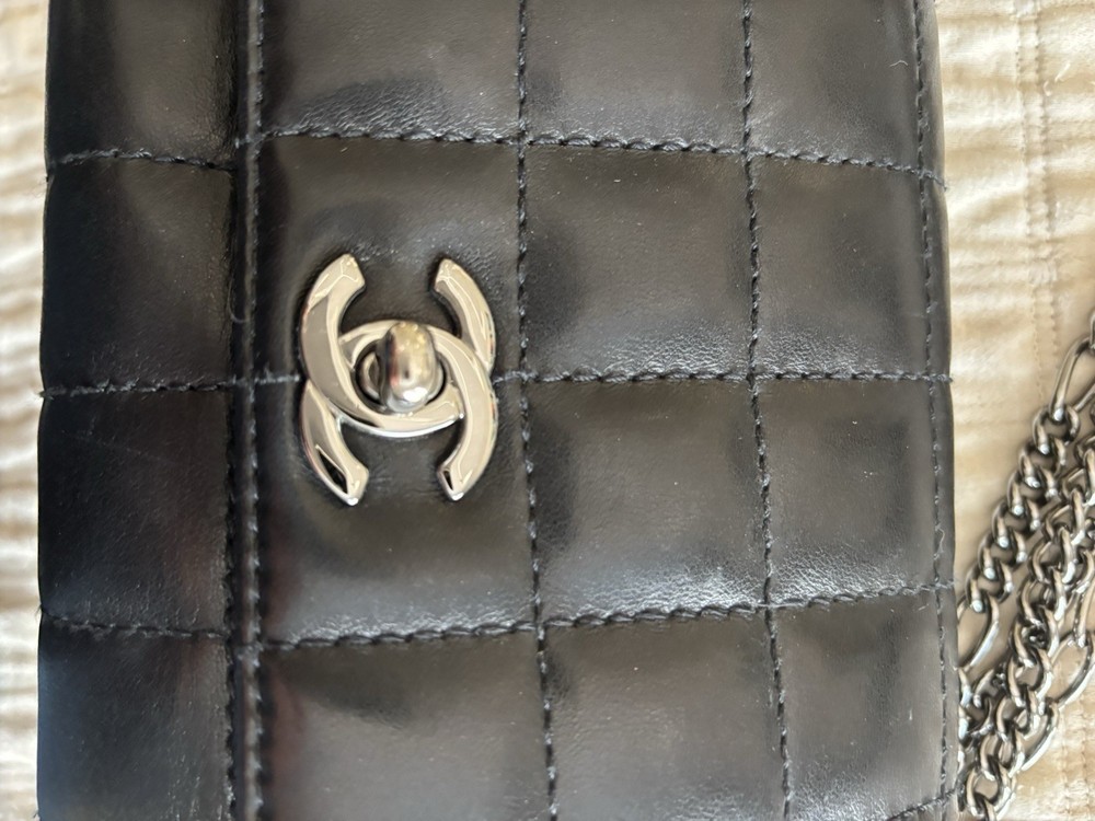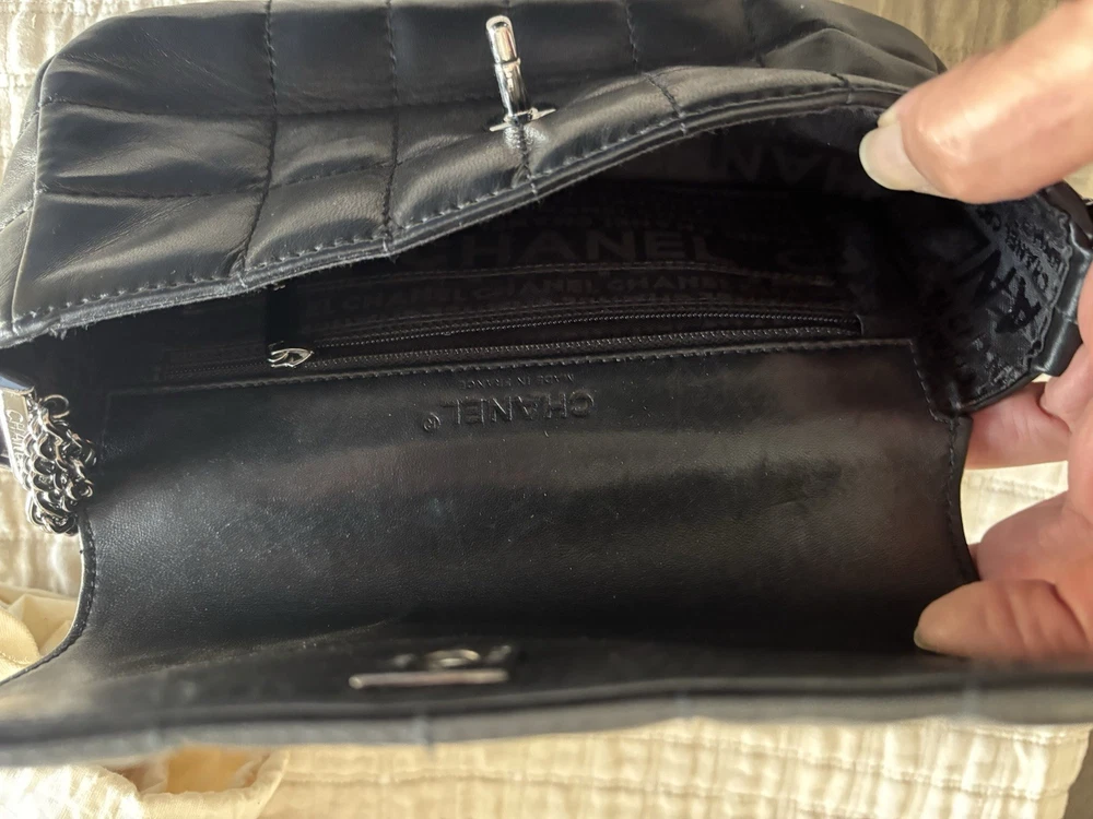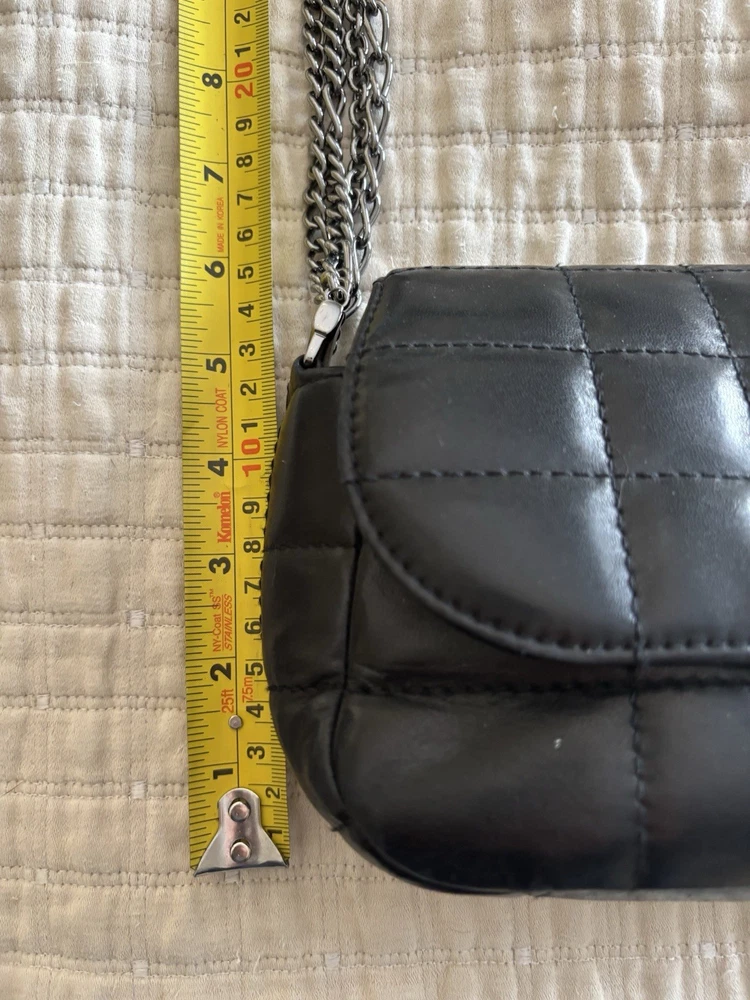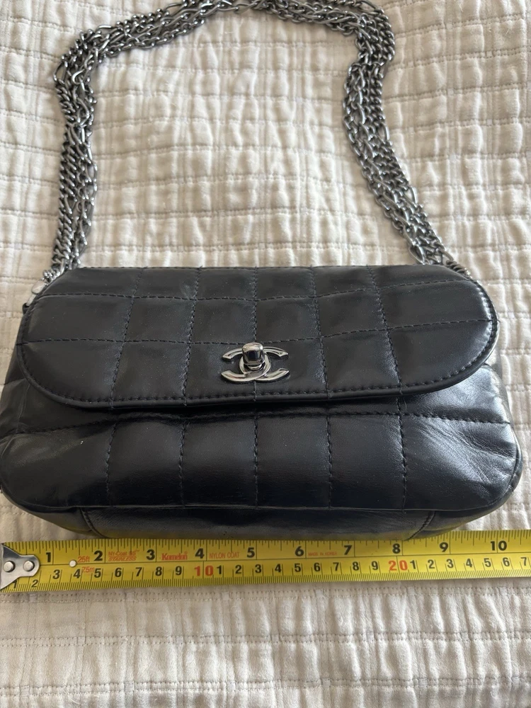 The Chanel bag is a stylish and luxurious shoulder bag designed for women. Made with unique square quilting and leather exterior, it features a sleek turn lock closure and silver hardware. The bag is lined with black leather and has a stylish shoulder strap handle style. With a matte finish and compact dimensions of 10 inches in width, 6 inches in height, and 3 inches in depth, this Chanel bag is the perfect accessory for any outfit, adding a touch of elegance to any ensemble.
