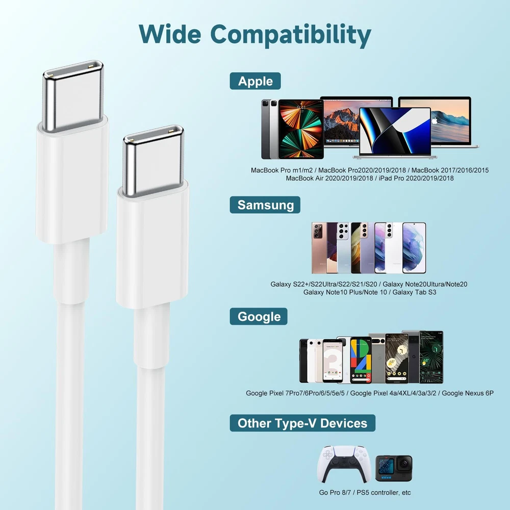 chcela USB C to USB C Cable 60W[3Pack] iPhone 15 Fast Charging Cable,6ft Long USB-C to USBC Power Cord for iPhone 15/15 Pro/15 Plus/15 Pro Max,MacBook Pro Air/IPad Air 4/5/iPad Pro 12.9/11(White) USB C to USB C Cable 60W[3Pack] iPhone 15 Fast Charging Cable,6ft Long USB-C to USBC Power Cord for iPhone 15/15 Pro/15 Plus/15 Pro Max,MacBook Pro Air/IPad Air 4/5/iPad Pro 12.9/11(White) 【60W Fast Charging】This Cable supports PD 3.0 & QC 3.0 fast charging, Max output up to 20V/3A, suit with USB-C adapters such as 18W/30W/45W/60W. USB 2.0 supports data transfer speed up to 480Mbps (40~60MB/S). 【Wide Compatibility】This USB C to USB C cable match all PD USB C charger. Compatible with MacBook Pro 13 inch, MacBook 12 inch 2020, 2019, 2018, 2017, 2016, New MacBook Air 2020 / 2019 / 2018, Compatible with iPad Pro 2018/2020/2021/2022, iPad Mini 6 2021, Air 4 2020, for Samsung Galaxy S22/ S22+/ S22 Ultra/ S21/ S21+/ S21 Ultra/ S20/ S20+/ S20 Ultra/ Note 20/ Note 20 Ultra/Note 10/ Note 10+/ A80, Google Pixel 4 3 2, 4XL, 3XL, 2XL, XL. 【A More Durable Charging Cable】Equipped with international safety standard certification, military-grade material made USB C to C cable more safe to avoid overheating, charred, and firing, adding durability and tangle free. Thanks to a 15,000-bend lifespan, this cable is more than ready to handle the stresses and strains of charging on the go. 【NOTE Before Purchase】This is a USB-C to USB-C cable, which means it has the same USB-C plug on both ends, please be aware that this is not a USB-C to Lightning cable. Besides, you may need a USB-C wall charger to charge your device. 【What you get】3 × USB C to USB C Cable (6ft), 12-Month worry-free period, If you have any questions, please contact us for free, and we will solve issues within 24 hours. Shipping from the USA All of our products are shipped from the USA, ensuring quick delivery to your destination. Payment We offer the following payment methods: PayPal, credit card, bank transfer, and eBay's secure payment system. Free Shipping & Free Returns Shipping within the USA is FREE. Additionally, any return is absolutely free for you. Risk-Free Purchase You have the option to return an item within 30 days without any justification. We cover the return shipping costs! Fast Shipping We ship immediately upon receipt of payment. Generally, the package is delivered within 2-3 days in the USA. If it takes longer, we will contact you. Quality and Costs Made in Europe, USA, China No customs fees or additional charges Total satisfaction guarantee Invoice with declared VAT available upon request in .pdf format Feedback Your feedback is very important to us. After you pay for your purchase, you will automatically receive positive feedback from us.